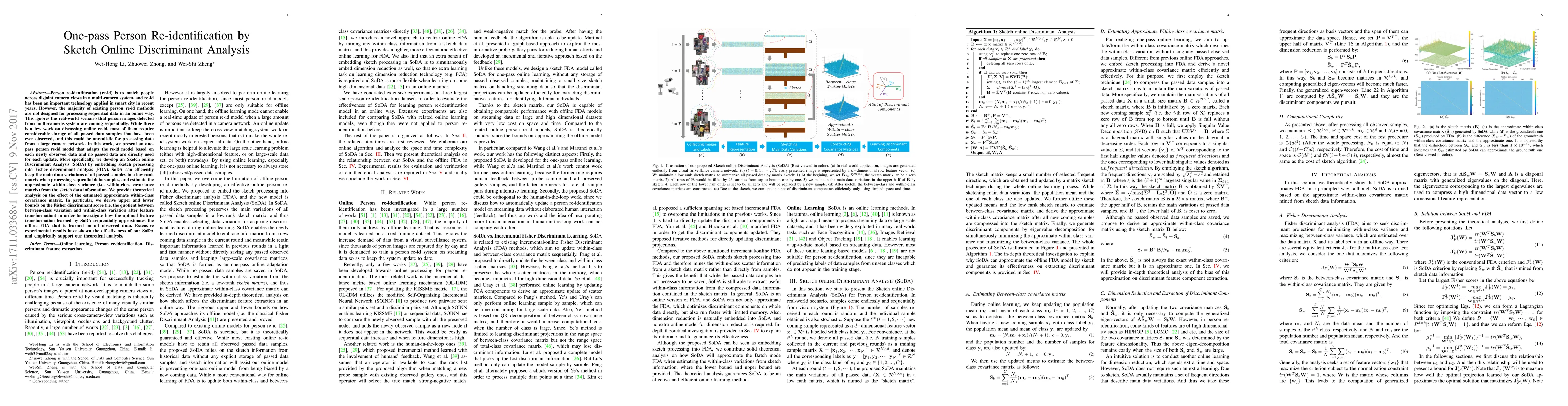 This paper proposes a one-pass person re-identification model called Sketch online Discriminant Analysis (SoDA) that adapts to new data without storing past observations. SoDA integrates sketch processing into Fisher discriminant analysis to efficiently manage sequential data, providing theoretical bounds on the Fisher discriminant score and demonstrating its effectiveness through experiments.