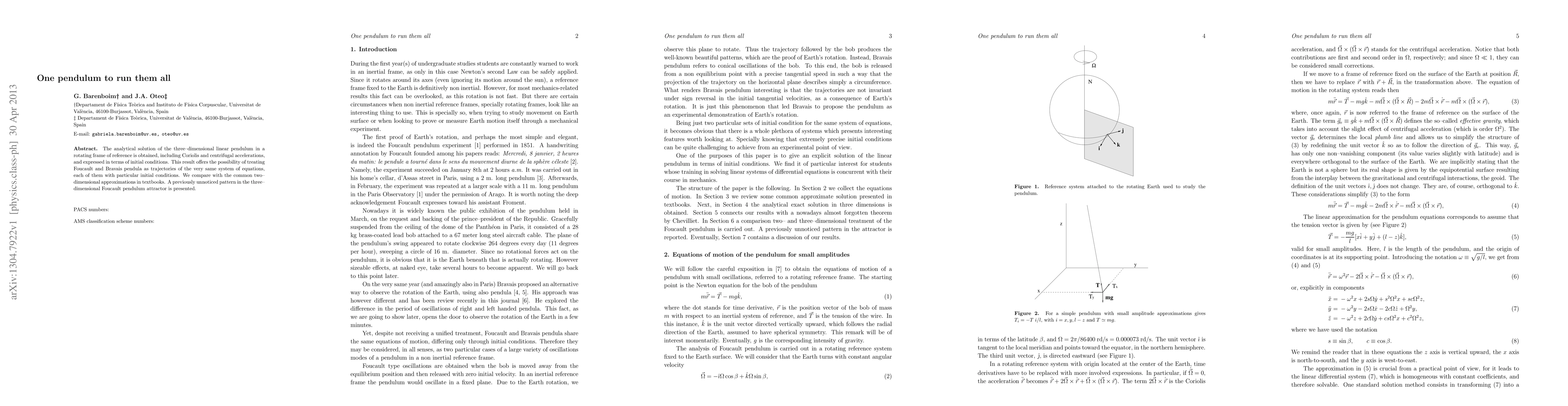 Researchers solved a 3D linear pendulum equation, finding a single pendulum can model both Foucault and Bravais pendulums with different initial conditions, revealing a new pattern in the 3D Foucault pendulum's attractor.