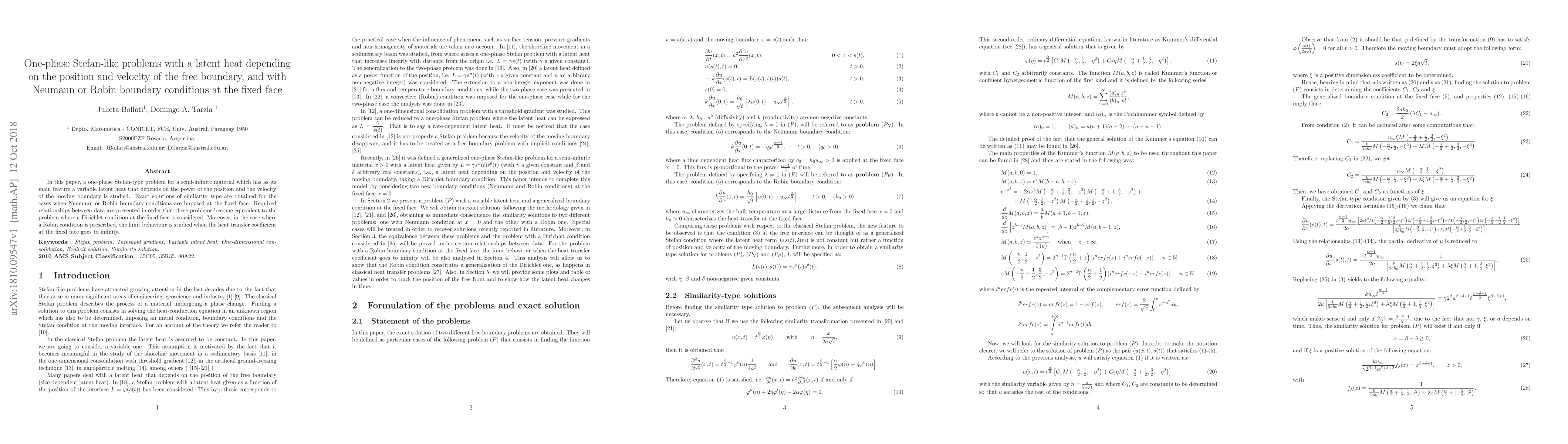 In this paper, a one-phase Stefan-type problem for a semi-infinite material which has as its main feature a variable latent heat that depends on the power of the position and the velocity of the moving boundary is studied. Exact solutions of similarity type are obtained for the cases when Neumann or Robin boundary conditions are imposed at the fixed face. Required relationships between data are presented in order that these problems become equivalent to the problem where a Dirichlet condition at the fixed face is considered. Moreover, in the case where a Robin condition is prescribed, the limit behaviour is studied when the heat transfer coefficient at the fixed face goes to infinity.