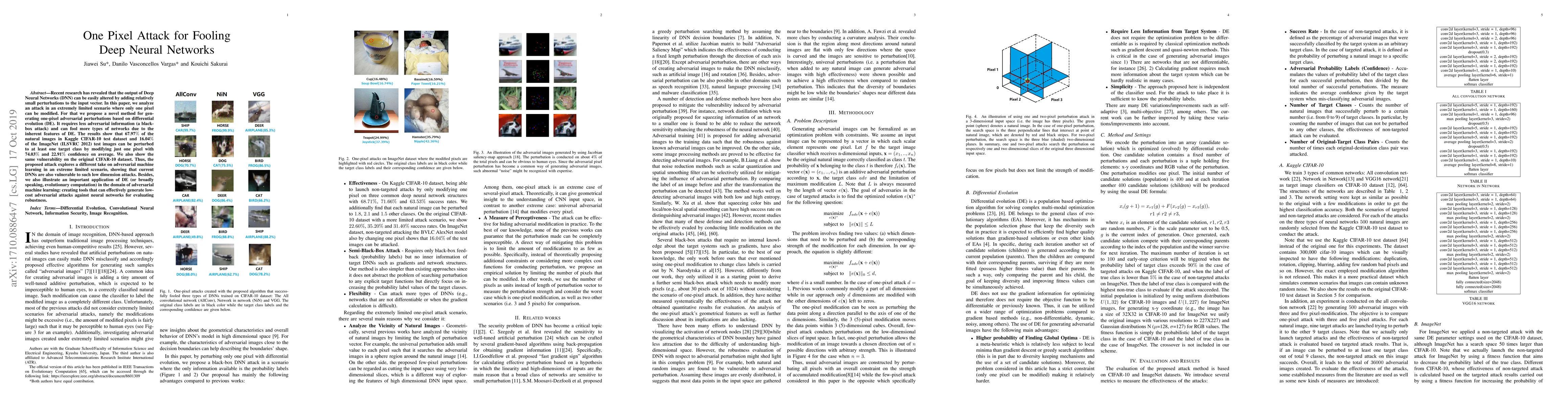 This paper proposes a novel one-pixel attack method using differential evolution to generate adversarial perturbations that can fool deep neural networks with minimal input changes. The attack demonstrates significant vulnerability in DNNs, successfully altering 67.97% of CI - The generated text has been blocked by our content filters.