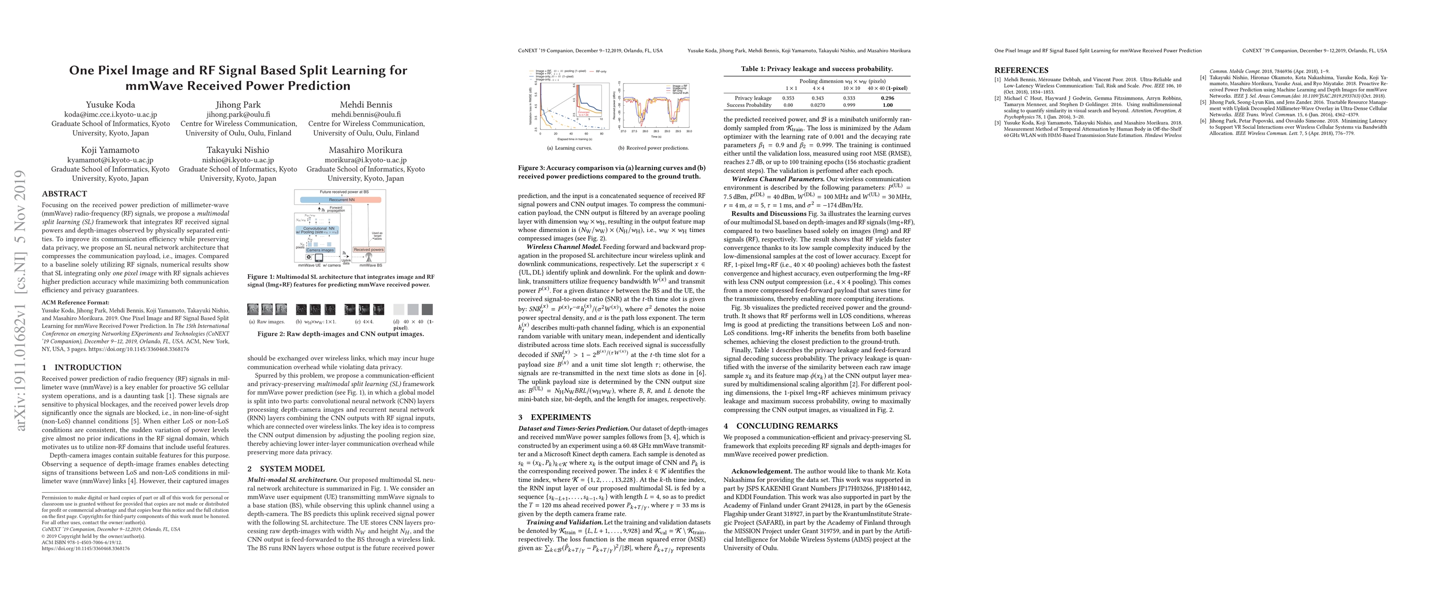 This paper proposes a multimodal split learning framework for predicting millimeter-wave RF signal received power by integrating RF signals and depth-images from separate entities. The framework achieves higher prediction accuracy using only one pixel image, enhancing communication efficiency and data privacy.