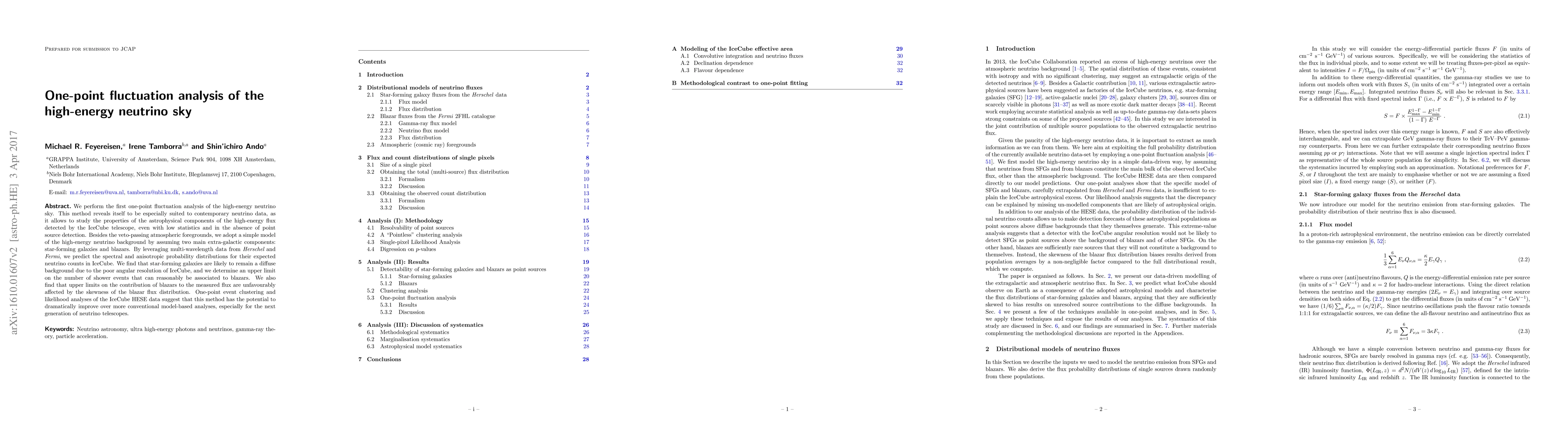We perform the first one-point fluctuation analysis of the high-energy neutrino sky. This method reveals itself to be especially suited to contemporary neutrino data, as it allows to study the properties of the astrophysical components of the high-energy flux detected by the IceCube telescope, even with low statistics and in the absence of point source detection. Besides the veto-passing atmospheric foregrounds, we adopt a simple model of the high-energy neutrino background by assuming two main extra-galactic components: star-forming galaxies and blazars. By leveraging multi-wavelength data from Herschel and Fermi, we predict the spectral and anisotropic probability distributions for their expected neutrino counts in IceCube. We find that star-forming galaxies are likely to remain a diffuse background due to the poor angular resolution of IceCube, and we determine an upper limit on the number of shower events that can reasonably be associated to blazars. We also find that upper limits on the contribution of blazars to the measured flux are unfavourably affected by the skewness of the blazar flux distribution. One-point event clustering and likelihood analyses of the IceCube HESE data suggest that this method has the potential to dramatically improve over more conventional model-based analyses, especially for the next generation of neutrino telescopes.