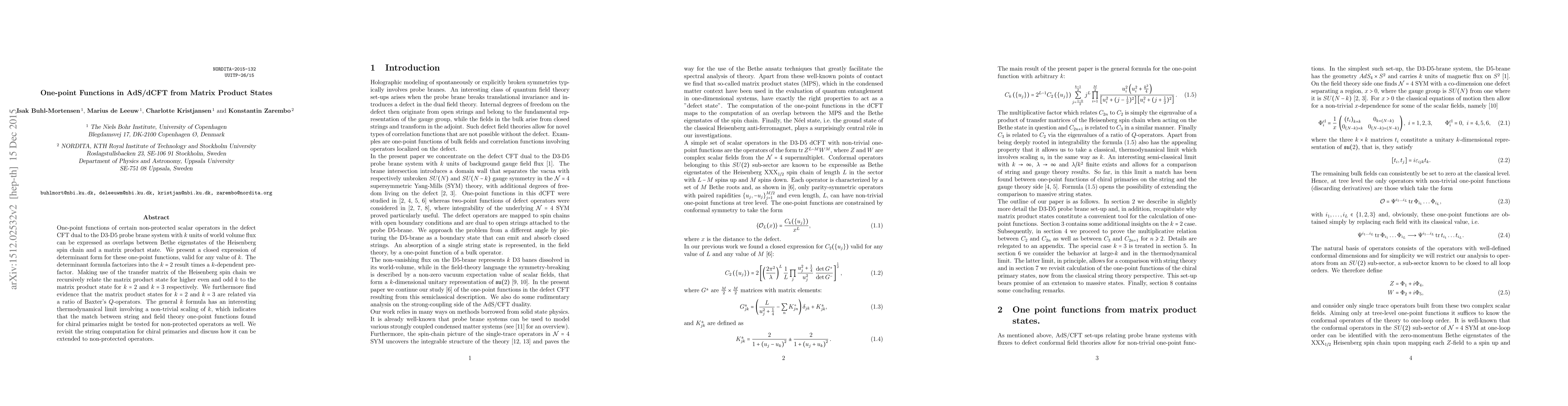 One-point functions of certain non-protected scalar operators in the defect CFT dual to the D3-D5 probe brane system with k units of world volume flux can be expressed as overlaps between Bethe eigenstates of the Heisenberg spin chain and a matrix product state. We present a closed expression of determinant form for these one-point functions, valid for any value of k. The determinant formula factorizes into the k=2 result times a k-dependent prefactor. Making use of the transfer matrix of the Heisenberg spin chain we recursively relate the matrix product state for higher even and odd k to the matrix product state for k=2 and k=3 respectively. We furthermore find evidence that the matrix product states for k=2 and k=3 are related via a ratio of Baxter's Q-operators. The general k formula has an interesting thermodynamical limit involving a non-trivial scaling of k, which indicates that the match between string and field theory one-point functions found for chiral primaries might be tested for non-protected operators as well. We revisit the string computation for chiral primaries and discuss how it can be extended to non-protected operators.