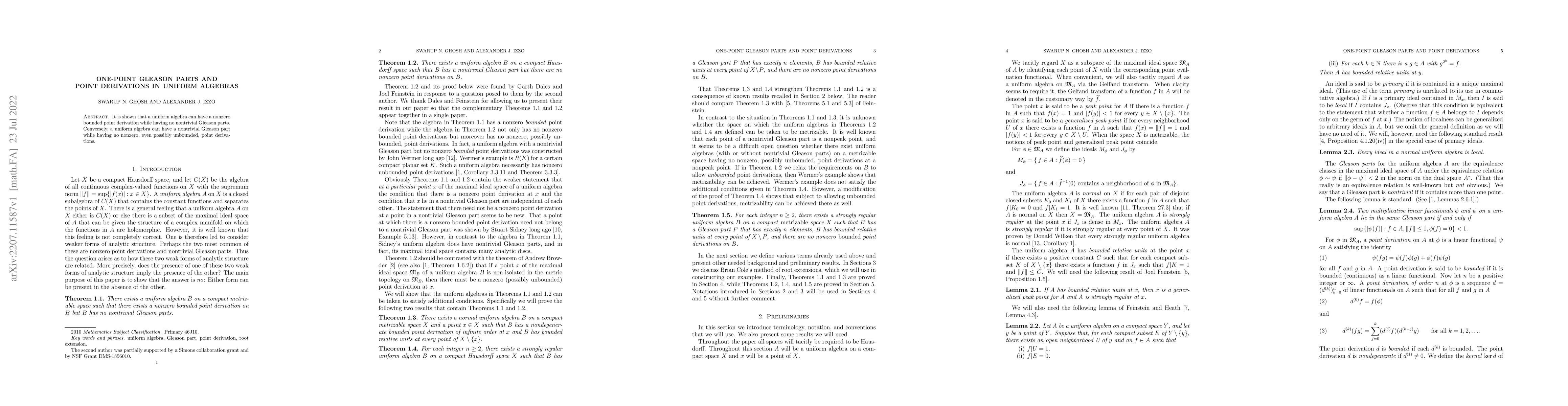 Summary: The paper explores the relationship between point derivations and Gleason parts in uniform algebras, demonstrating that the existence of one does not necessarily imply the existence of the other, highlighting distinct scenarios where one may exist without the other.