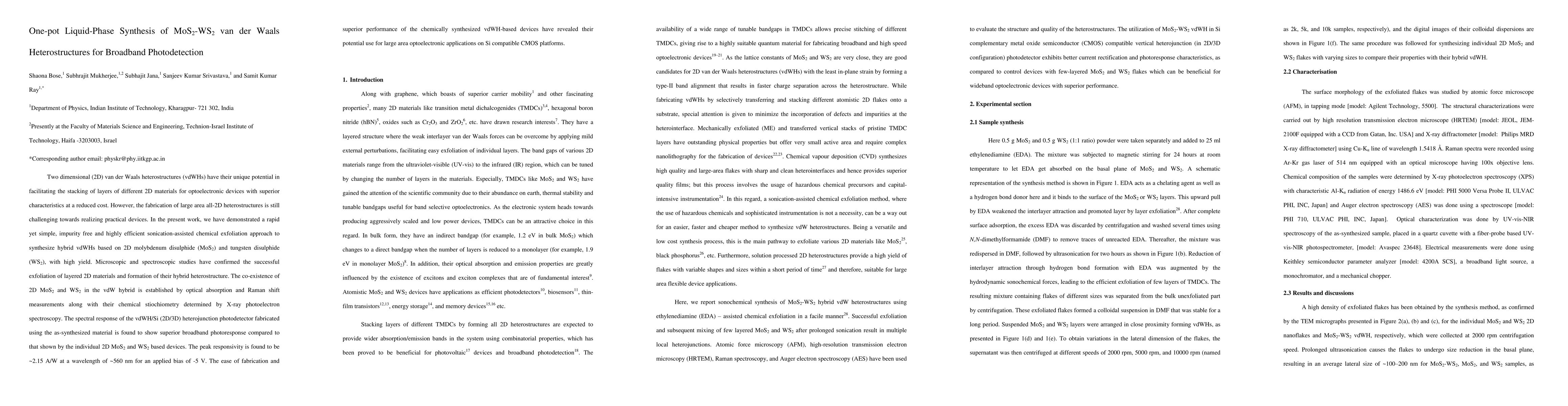Two dimensional (2D) van der Waals heterostructures (vdWHs) have their unique potential in facilitating the stacking of layers of different 2D materials for optoelectronic devices with superior characteristics at a reduced cost. However, the fabrication of large area all-2D heterostructures is still challenging towards realizing practical devices. In the present work, we have demonstrated a rapid yet simple, impurity free and highly efficient sonication-assisted chemical exfoliation approach to synthesize hybrid vdWHs based on 2D molybdenum disulphide (MoS$_2$) and tungsten disulphide (WS$_2$), with high yield. Microscopic and spectroscopic studies have confirmed the successful exfoliation of layered 2D materials and formation of their hybrid heterostructure. The co-existence of 2D MoS2 and WS2 in the vdW hybrid is established by optical absorption and Raman shift measurements along with their chemical stiochiometry determined by X-ray photoelectron spectroscopy. The spectral response of the vdWH/Si (2D/3D) heterojunction photodetector fabricated using the as-synthesized material is found to show superior broadband photoresponse compared to that shown by the individual 2D MoS$_2$ and WS$_2$ based devices. The peak responsivity is found to be ~2.15 A/W at a wavelength of ~560 nm for an applied bias of -5 V. The ease of fabrication and superior performance of the chemically synthesized vdWH-based devices have revealed their potential use for large area optoelectronic applications on Si compatible CMOS platforms.