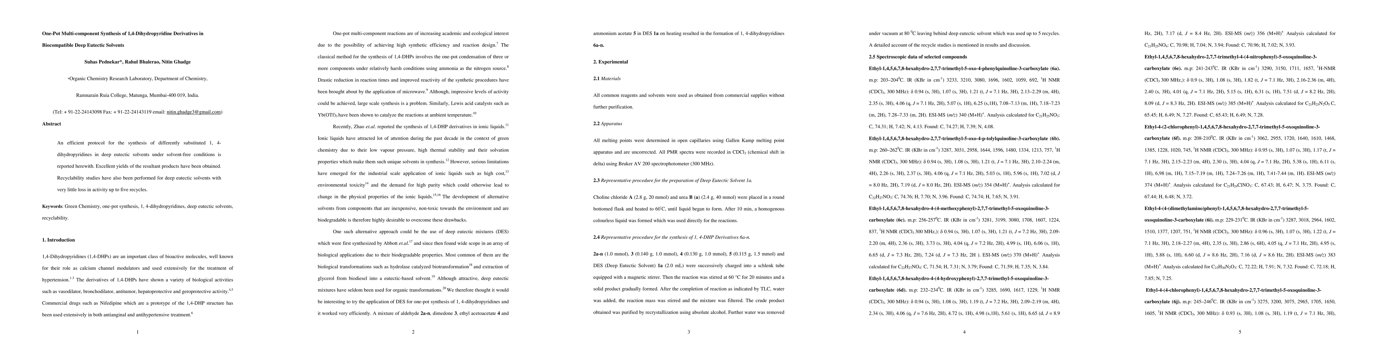 This paper presents an efficient one-pot synthesis of 1,4-dihydropyridine derivatives using biocompatible deep eutectic solvents under solvent-free conditions, achieving excellent yields. The deep eutectic solvents demonstrate high recyclability with minimal loss in activity over five cycles.