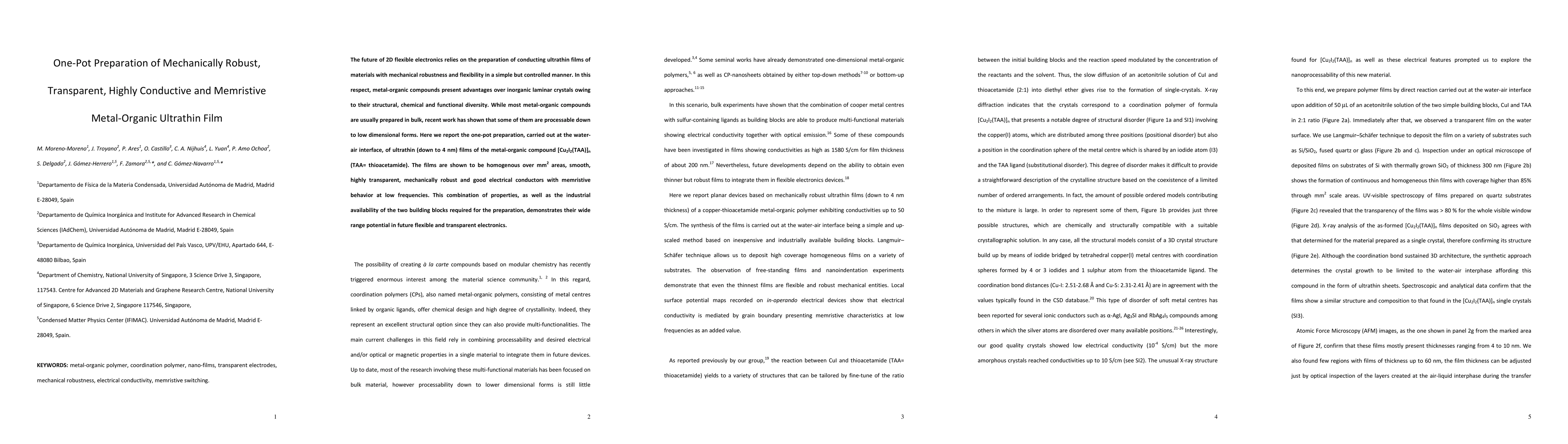 This paper reports the one-pot synthesis of ultrathin, transparent, mechanically robust, and highly conductive metal-organic films with memristive behavior, paving the way for advanced flexible electronics. The films exhibit excellent properties due to the structural and functional diversity of metal-organic compounds.