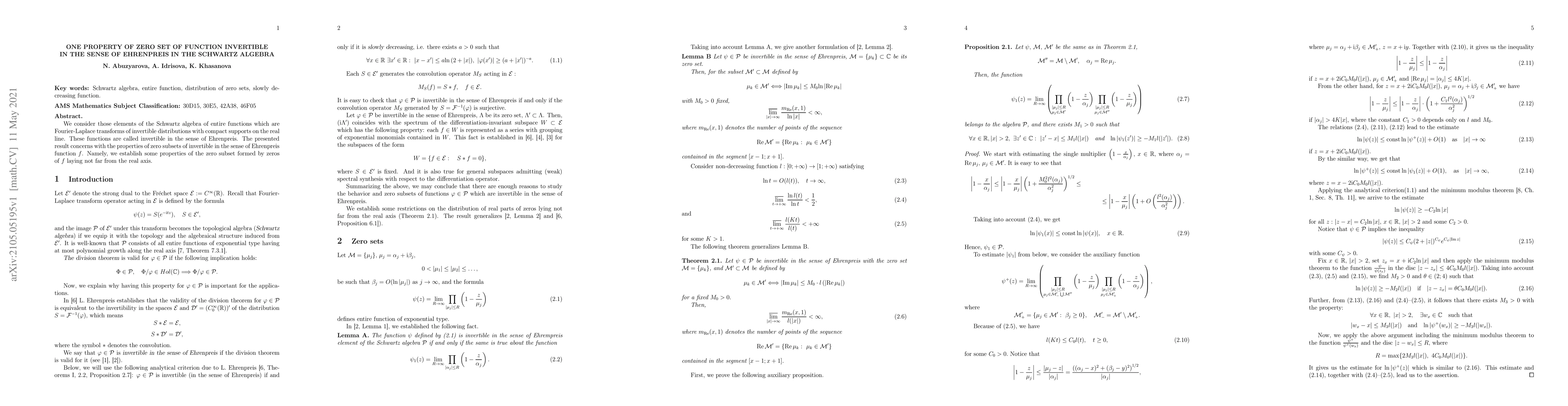 We consider those elements of the Schwartz algebra of entire functions which are Fourier-Laplace transforms of invertible distributions with compact supports on the real line. These functions are called invertible in the sense of Ehrenpreis. The presented result concerns with the properties of zero subsets of invertible in the sense of Ehrenpreis function f. Namely, we establish some properties of the zero subset formed by zeros of f laying not far from the real axis.