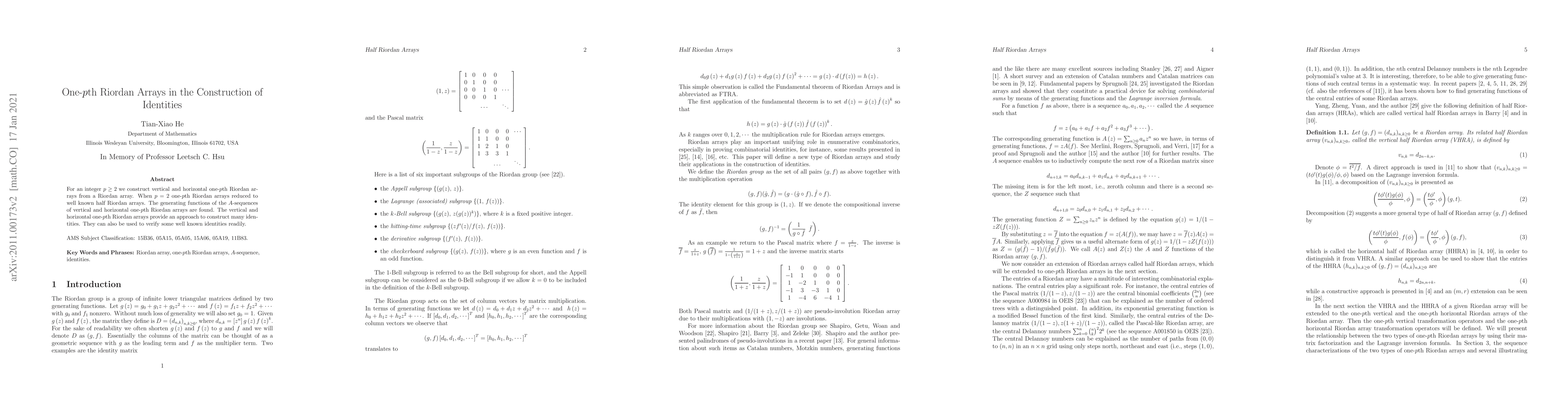 This paper constructs vertical and horizontal one-pth Riordan arrays from a Riordan array for $p\geq 2$, with special cases for $p=2$ reducing to half Riordan arrays. It finds generating functions for these arrays and demonstrates their utility in constructing and verifying identities.