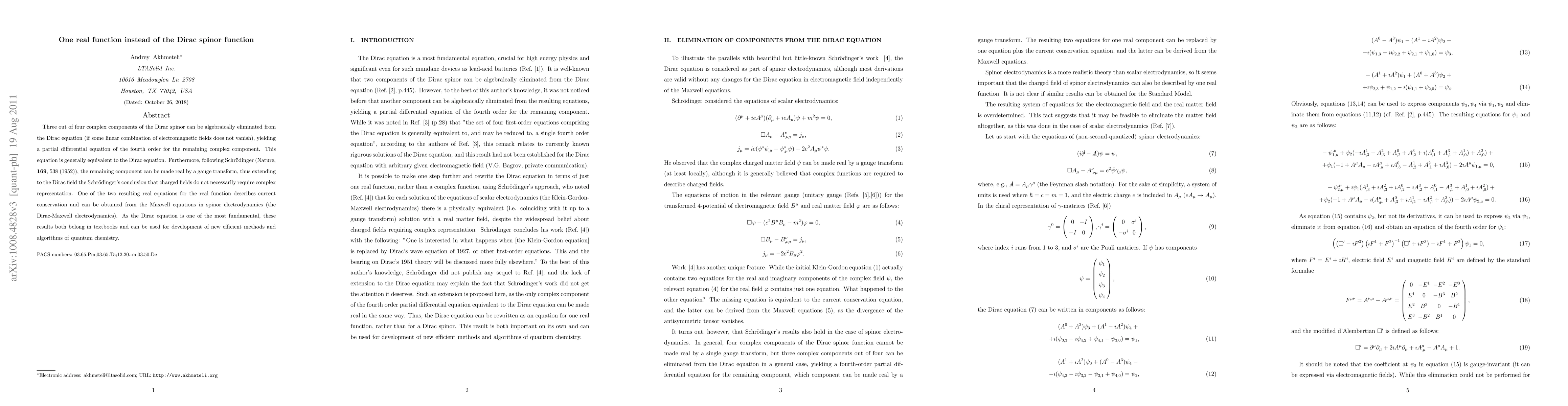 This paper proposes reducing the Dirac spinor to a single real function by eliminating three of its four complex components under specific electromagnetic conditions, leading to a fourth-order partial differential equation. This approach generalizes Schrödinger’s conclusion for charged fields, potentially simplifying quantum chemistry methods and algorithms.