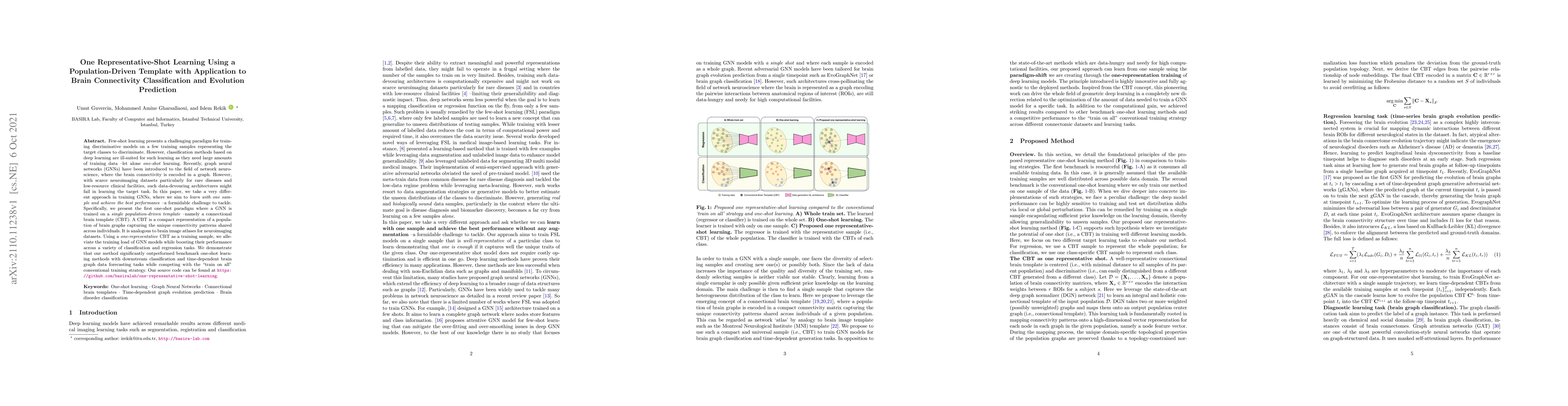 Few-shot learning presents a challenging paradigm for training discriminative models on a few training samples representing the target classes to discriminate. However, classification methods based on deep learning are ill-suited for such learning as they need large amounts of training data --let alone one-shot learning. Recently, graph neural networks (GNNs) have been introduced to the field of network neuroscience, where the brain connectivity is encoded in a graph. However, with scarce neuroimaging datasets particularly for rare diseases and low-resource clinical facilities, such data-devouring architectures might fail in learning the target task. In this paper, we take a very different approach in training GNNs, where we aim to learn with one sample and achieve the best performance --a formidable challenge to tackle. Specifically, we present the first one-shot paradigm where a GNN is trained on a single population-driven template --namely a connectional brain template (CBT). A CBT is a compact representation of a population of brain graphs capturing the unique connectivity patterns shared across individuals. It is analogous to brain image atlases for neuroimaging datasets. Using a one-representative CBT as a training sample, we alleviate the training load of GNN models while boosting their performance across a variety of classification and regression tasks. We demonstrate that our method significantly outperformed benchmark one-shot learning methods with downstream classification and time-dependent brain graph data forecasting tasks while competing with the train-on-all conventional training strategy. Our source code can be found at https://github.com/basiralab/one-representative-shot-learning.