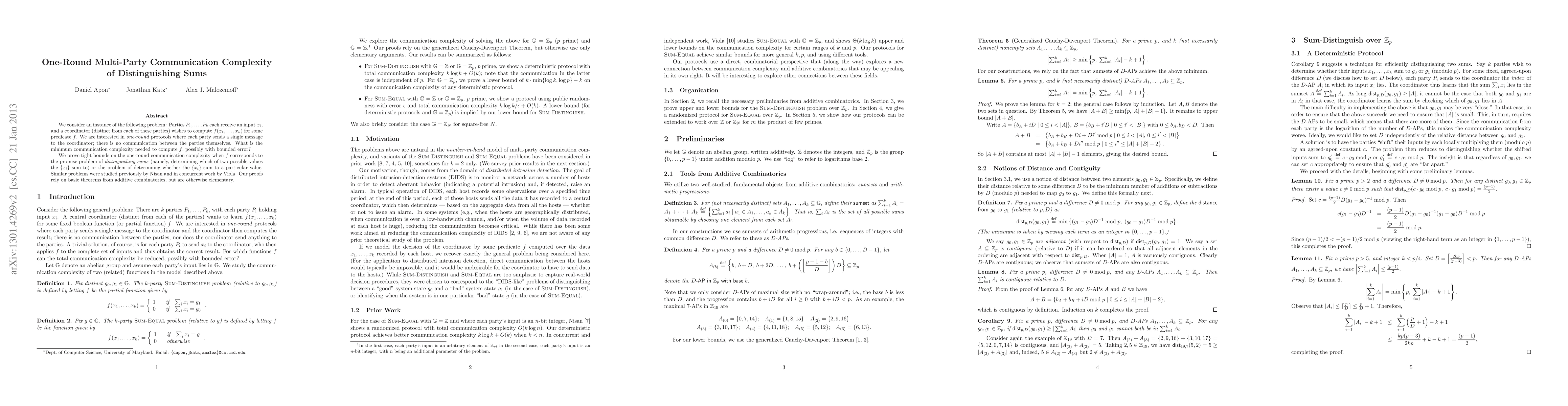 We consider an instance of the following problem: Parties P_1,..., P_k each receive an input x_i, and a coordinator (distinct from each of these parties) wishes to compute f(x_1,..., x_k) for some predicate f. We are interested in one-round protocols where each party sends a single message to the coordinator; there is no communication between the parties themselves. What is the minimum communication complexity needed to compute f, possibly with bounded error? We prove tight bounds on the one-round communication complexity when f corresponds to the promise problem of distinguishing sums (namely, determining which of two possible values the {x_i} sum to) or the problem of determining whether the {x_i} sum to a particular value. Similar problems were studied previously by Nisan and in concurrent work by Viola. Our proofs rely on basic theorems from additive combinatorics, but are otherwise elementary.