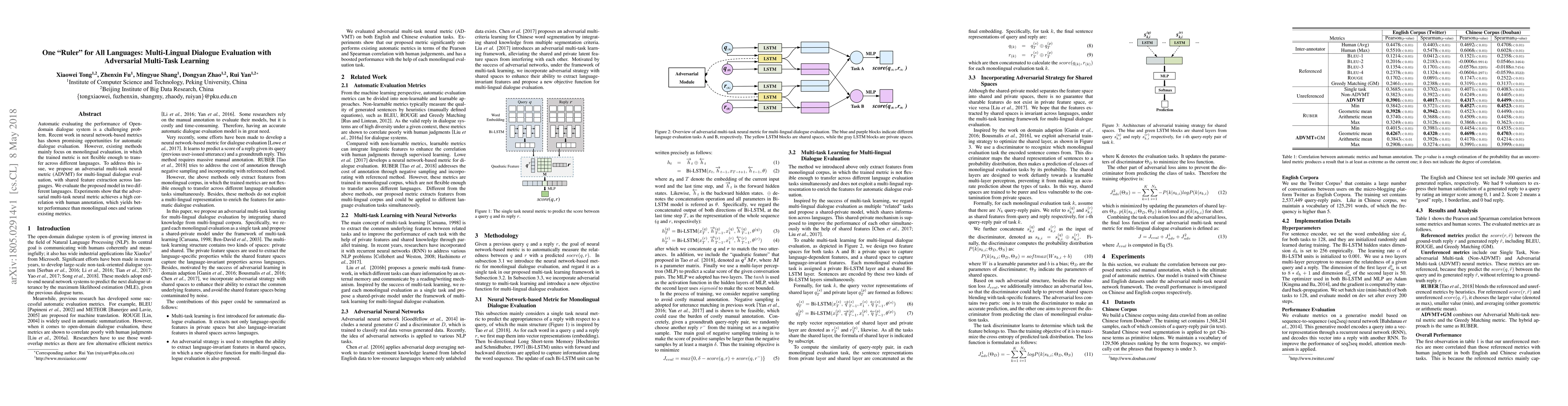 This paper proposes an adversarial multi-task neural metric (ADVMT) for evaluating multi-lingual dialogue systems, utilizing shared feature extraction across languages. The model demonstrates superior performance compared to monolingual methods and existing metrics, as evidenced by its high correlation with human annotations in two different languages.