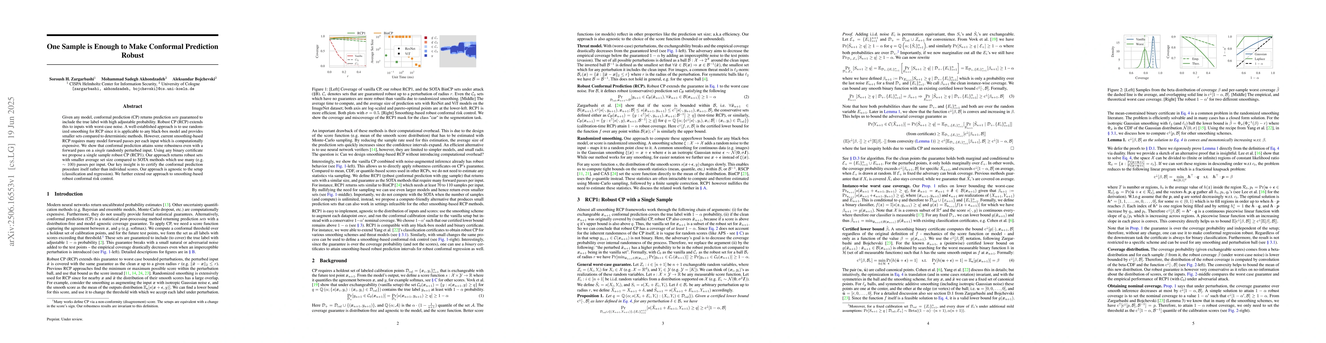 Given any model, conformal prediction (CP) returns prediction sets guaranteed to include the true label with high adjustable probability. Robust CP (RCP) extends this to inputs with worst-case noise. A well-established approach is to use randomized smoothing for RCP since it is applicable to any black-box model and provides smaller sets compared to deterministic methods. However, current smoothing-based RCP requires many model forward passes per each input which is computationally expensive. We show that conformal prediction attains some robustness even with a forward pass on a single randomly perturbed input. Using any binary certificate we propose a single sample robust CP (RCP1). Our approach returns robust sets with smaller average set size compared to SOTA methods which use many (e.g. around 100) passes per input. Our key insight is to certify the conformal prediction procedure itself rather than individual scores. Our approach is agnostic to the setup (classification and regression). We further extend our approach to smoothing-based robust conformal risk control.