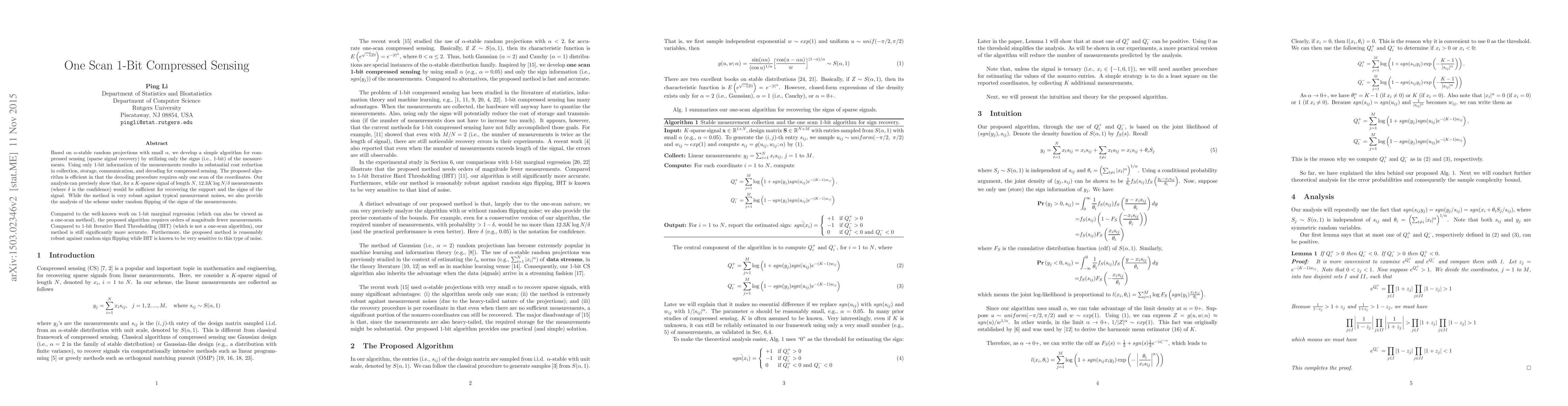 This paper proposes a one-scan algorithm for 1-bit compressed sensing using $\alpha$-stable random projections, requiring only the signs of measurements for sparse signal recovery. The method achieves substantial cost reduction with fewer measurements and is more accurate and robust than existing 1-bit methods.