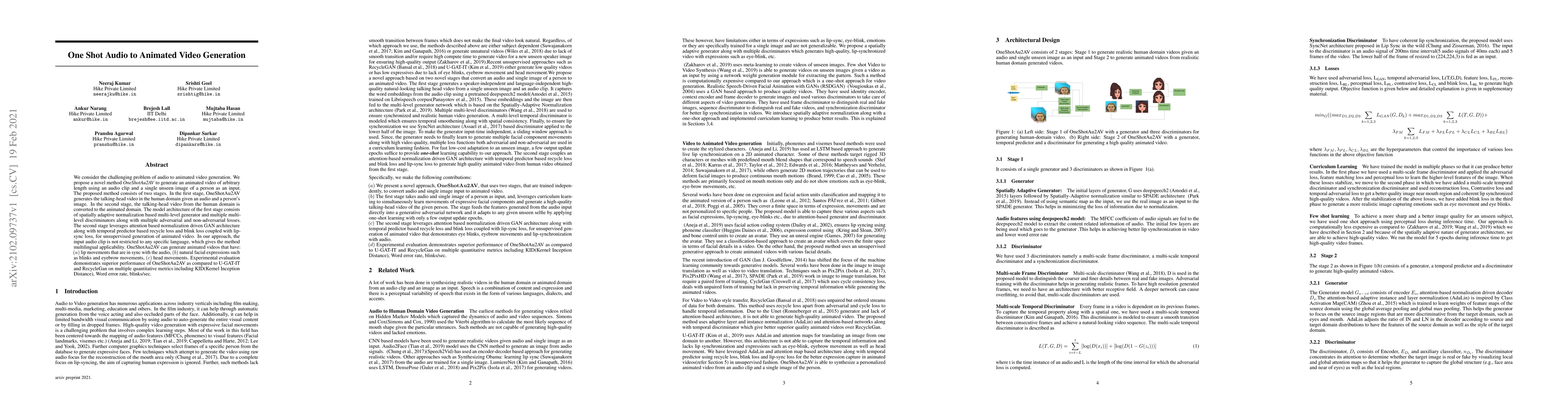 This paper proposes OneShotAu2AV, a novel method for generating animated videos from an audio clip and a single unseen person image. The method consists of two stages: generating a talking-head video in the human domain and converting it to the animated domain, achieving lip-sync, natural facial expressions, and head movements. Experimental results show superior performance over existing models on multiple metrics.