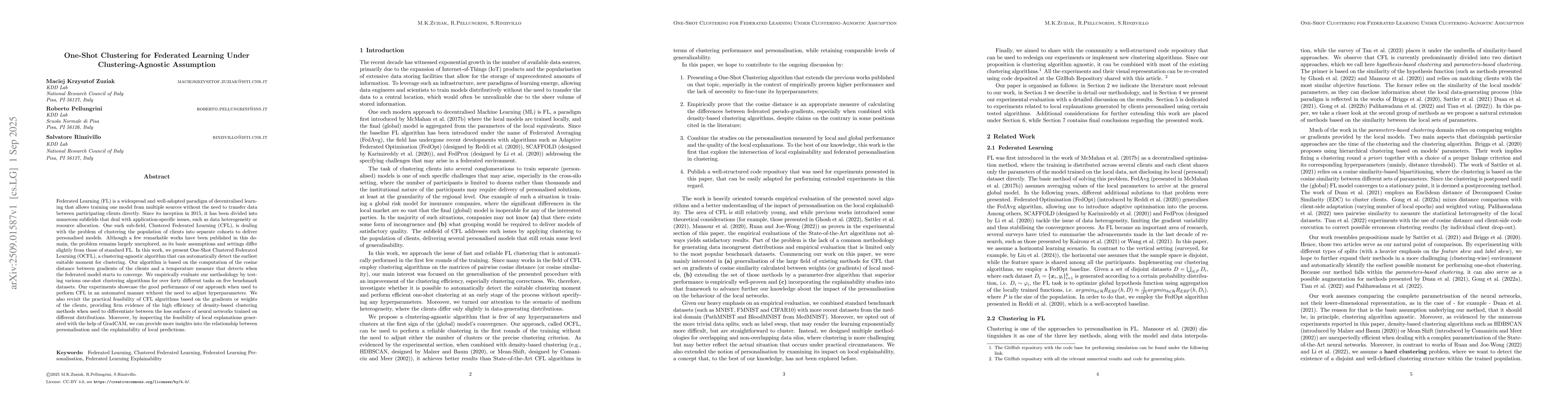 Federated Learning (FL) is a widespread and well-adopted paradigm of decentralised learning that allows training one model from multiple sources without the need to transfer data between participating clients directly. Since its inception in 2015, it has been divided into numerous subfields that deal with application-specific issues, such as data heterogeneity or resource allocation. One such sub-field, Clustered Federated Learning (CFL), deals with the problem of clustering the population of clients into separate cohorts to deliver personalised models. Although a few remarkable works have been published in this domain, the problem remains largely unexplored, as its basic assumptions and settings differ slightly from those of standard FL. In this work, we present One-Shot Clustered Federated Learning (OCFL), a clustering-agnostic algorithm that can automatically detect the earliest suitable moment for clustering. Our algorithm is based on computing the cosine distance between the gradients of the clients and a temperature measure that detects when the federated model starts to converge. We empirically evaluate our methodology by testing various one-shot clustering algorithms for over forty different tasks on five benchmark datasets. Our experiments showcase the good performance of our approach when used to perform CFL in an automated manner without the need to adjust hyperparameters. We also revisit the practical feasibility of CFL algorithms based on the gradients of the clients, providing firm evidence of the high efficiency of density-based clustering methods when used to differentiate between the loss surfaces of neural networks trained on different distributions. Moreover, by inspecting the feasibility of local explanations generated with the help of GradCAM, we can provide more insights into the relationship between personalisation and the explainability of local predictions.