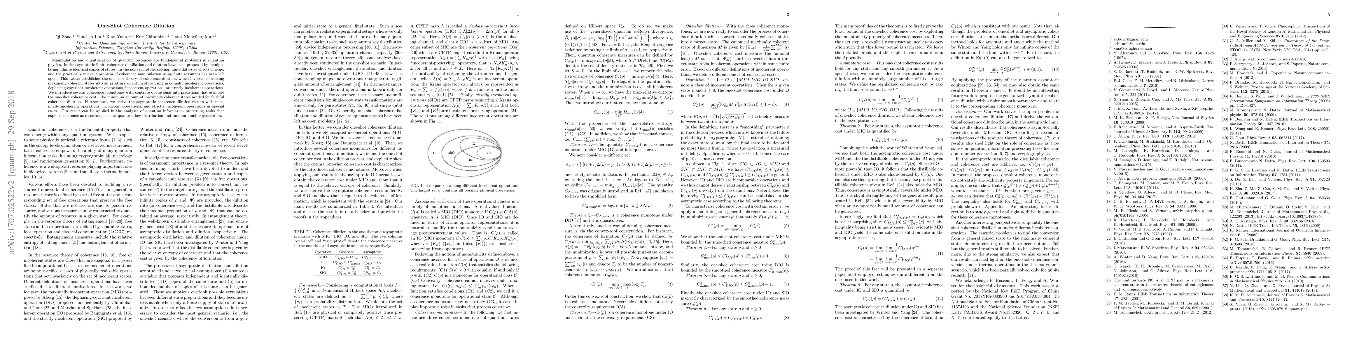 This paper develops the one-shot theory of coherence dilution, introducing coherence monotones to quantify the minimum amount of maximally coherent states required for converting them into arbitrary states using various incoherent operations. The findings provide insights into quantum information processing tasks that utilize coherence.