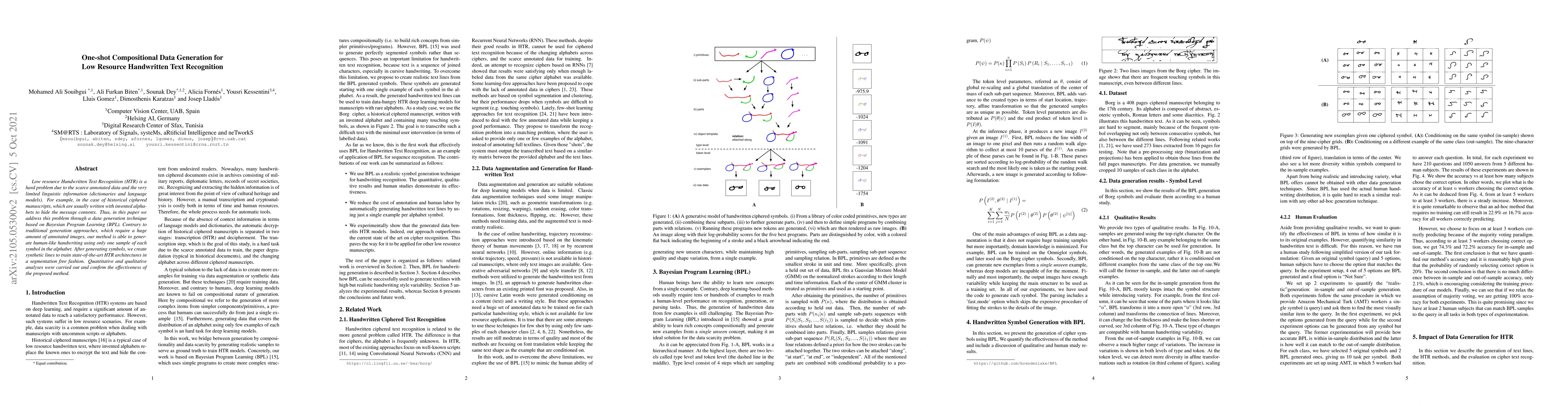This paper proposes a Bayesian Program Learning (BPL) technique for generating compositional data to train low-resource Handwritten Text Recognition (HTR) systems, requiring only one sample per symbol. The method synthesizes handwriting from minimal input and trains HTR models without segmentation, demonstrating effectiveness through quantitative and qualitative analyses.