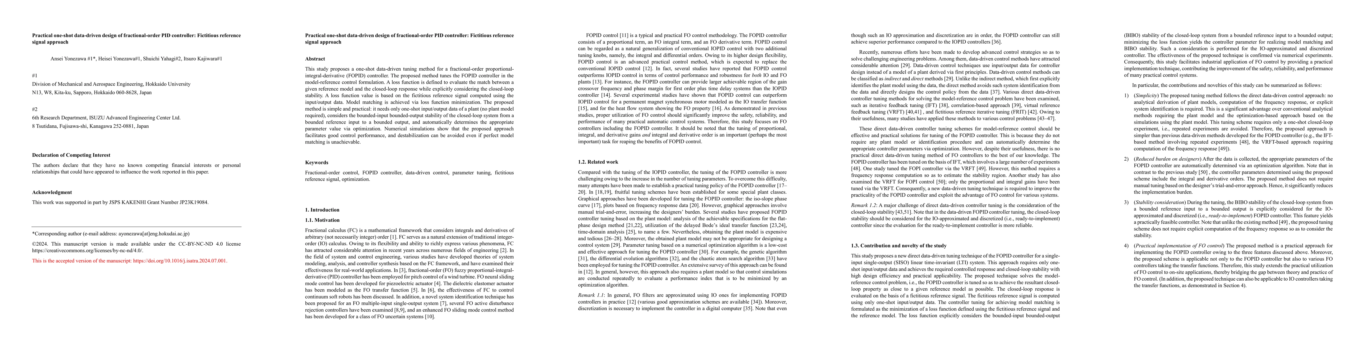 This paper proposes a one-shot data-driven method for tuning a fractional-order PID controller using input/output data without requiring a plant model. The method considers closed-loop stability through a loss function based on a fictitious reference signal, ensuring good control performance and stability.