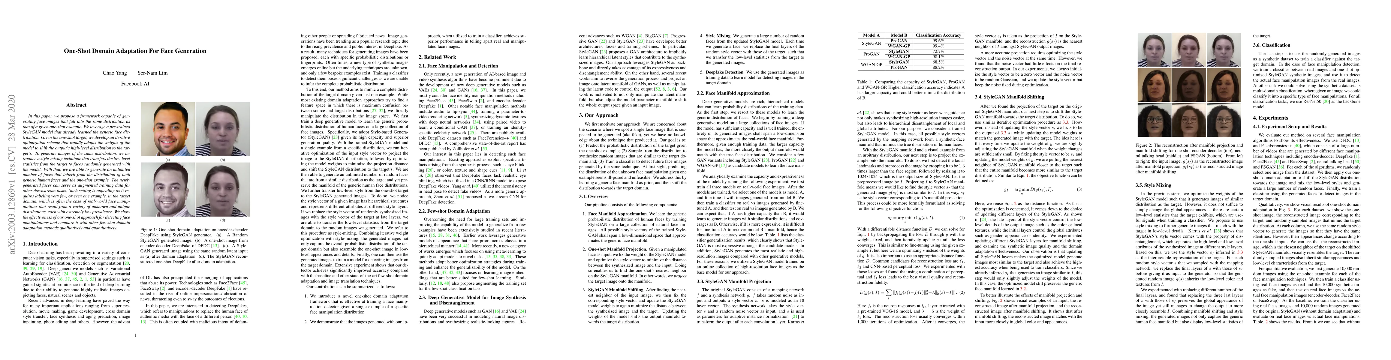 In this paper, we propose a framework capable of generating face images that fall into the same distribution as that of a given one-shot example. We leverage a pre-trained StyleGAN model that already learned the generic face distribution. Given the one-shot target, we develop an iterative optimization scheme that rapidly adapts the weights of the model to shift the output's high-level distribution to the target's. To generate images of the same distribution, we introduce a style-mixing technique that transfers the low-level statistics from the target to faces randomly generated with the model. With that, we are able to generate an unlimited number of faces that inherit from the distribution of both generic human faces and the one-shot example. The newly generated faces can serve as augmented training data for other downstream tasks. Such setting is appealing as it requires labeling very few, or even one example, in the target domain, which is often the case of real-world face manipulations that result from a variety of unknown and unique distributions, each with extremely low prevalence. We show the effectiveness of our one-shot approach for detecting face manipulations and compare it with other few-shot domain adaptation methods qualitatively and quantitatively.