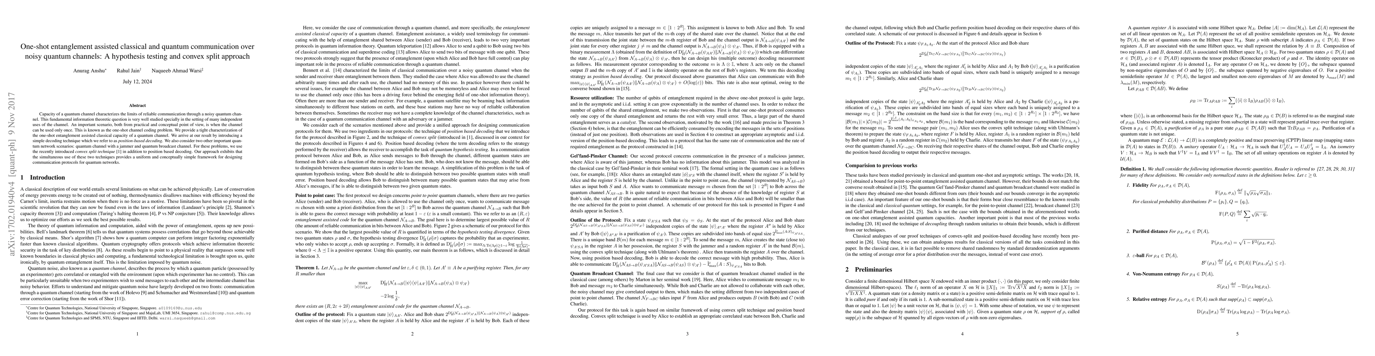 This paper characterizes the one-shot entanglement assisted classical capacity of a quantum channel using a new decoding technique called position-based decoding. It also applies a convex split approach to tackle quantum channel problems with a jammer and quantum broadcast channels, demonstrating a unified framework for quantum network communication protocols.