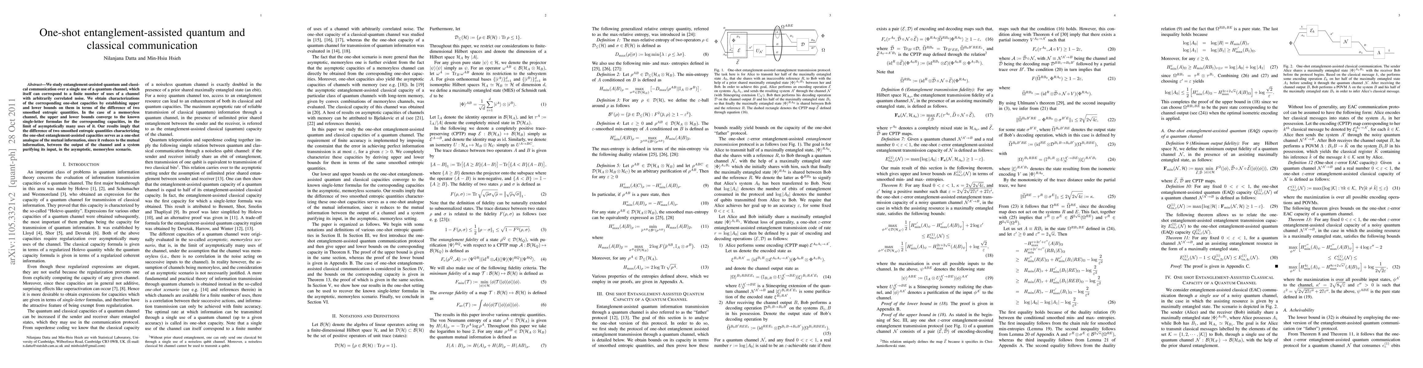 This paper investigates entanglement-assisted quantum and classical communication in a single-use quantum channel, establishing upper and lower bounds for one-shot capacities in terms of smoothed entropic quantities. For memoryless channels, these bounds converge to the known single-letter formulas, indicating that the difference of these entropic quantities acts as a one-shot analogue of mutual information.