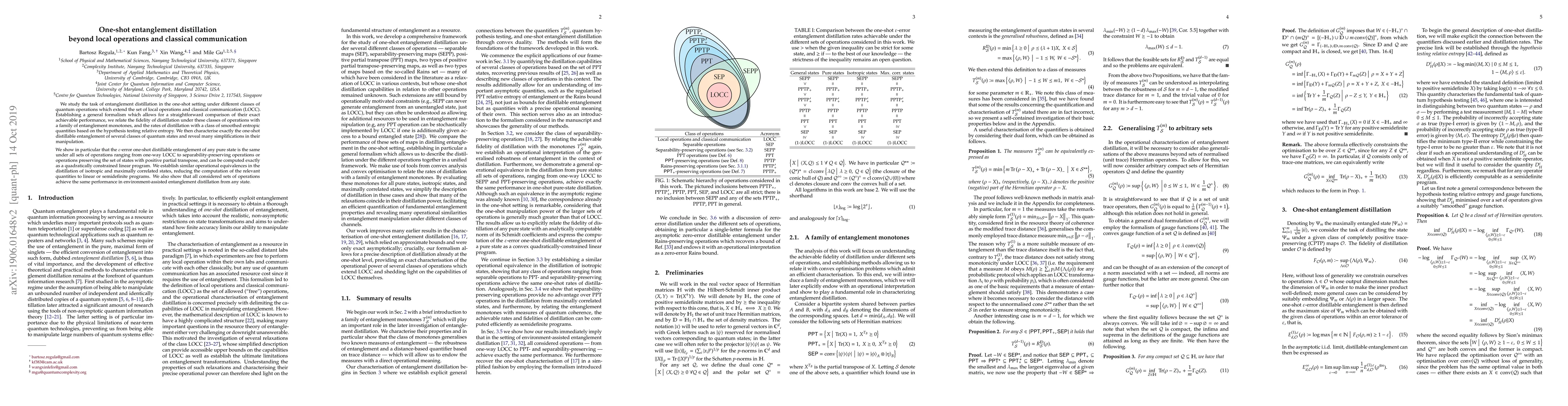 We study the task of entanglement distillation in the one-shot setting under different classes of quantum operations which extend the set of local operations and classical communication (LOCC). Establishing a general formalism which allows for a straightforward comparison of their exact achievable performance, we relate the fidelity of distillation under these classes of operations with a family of entanglement monotones and the rates of distillation with a class of smoothed entropic quantities based on the hypothesis testing relative entropy. We then characterise exactly the one-shot distillable entanglement of several classes of quantum states and reveal many simplifications in their manipulation. We show in particular that the $\varepsilon$-error one-shot distillable entanglement of any pure state is the same under all sets of operations ranging from one-way LOCC to separability-preserving operations or operations preserving the set of states with positive partial transpose, and can be computed exactly as a quadratically constrained linear program. We establish similar operational equivalences in the distillation of isotropic and maximally correlated states, reducing the computation of the relevant quantities to linear or semidefinite programs. We also show that all considered sets of operations achieve the same performance in environment-assisted entanglement distillation from any state.