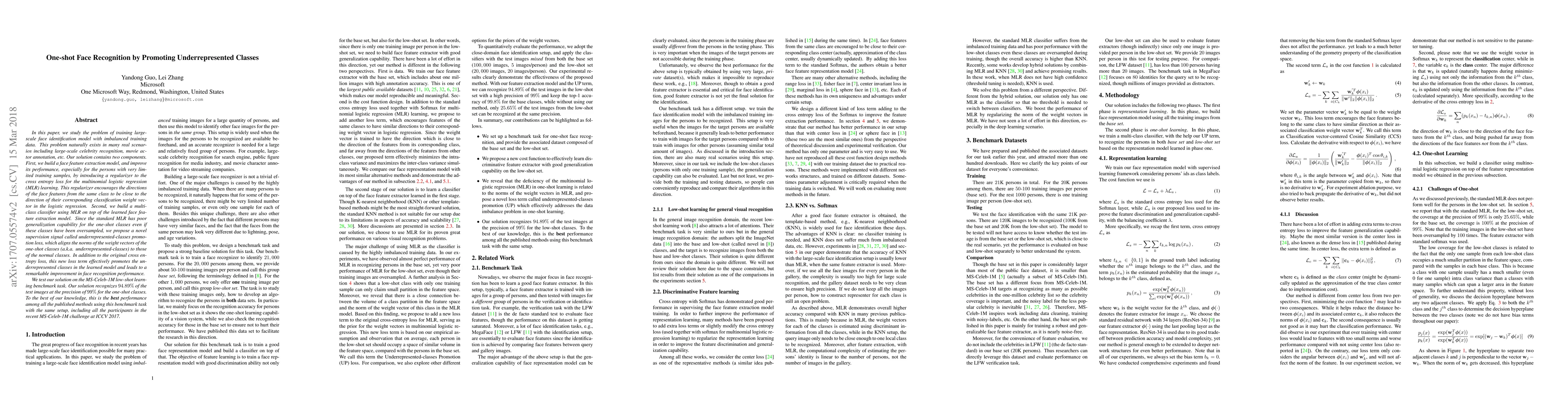 In this paper, we study the problem of training large-scale face identification model with imbalanced training data. This problem naturally exists in many real scenarios including large-scale celebrity recognition, movie actor annotation, etc. Our solution contains two components. First, we build a face feature extraction model, and improve its performance, especially for the persons with very limited training samples, by introducing a regularizer to the cross entropy loss for the multi-nomial logistic regression (MLR) learning. This regularizer encourages the directions of the face features from the same class to be close to the direction of their corresponding classification weight vector in the logistic regression. Second, we build a multi-class classifier using MLR on top of the learned face feature extraction model. Since the standard MLR has poor generalization capability for the one-shot classes even if these classes have been oversampled, we propose a novel supervision signal called underrepresented-classes promotion loss, which aligns the norms of the weight vectors of the one-shot classes (a.k.a. underrepresented-classes) to those of the normal classes. In addition to the original cross entropy loss, this new loss term effectively promotes the underrepresented classes in the learned model and leads to a remarkable improvement in face recognition performance. We test our solution on the MS-Celeb-1M low-shot learning benchmark task. Our solution recognizes 94.89% of the test images at the precision of 99\% for the one-shot classes. To the best of our knowledge, this is the best performance among all the published methods using this benchmark task with the same setup, including all the participants in the recent MS-Celeb-1M challenge at ICCV 2017.