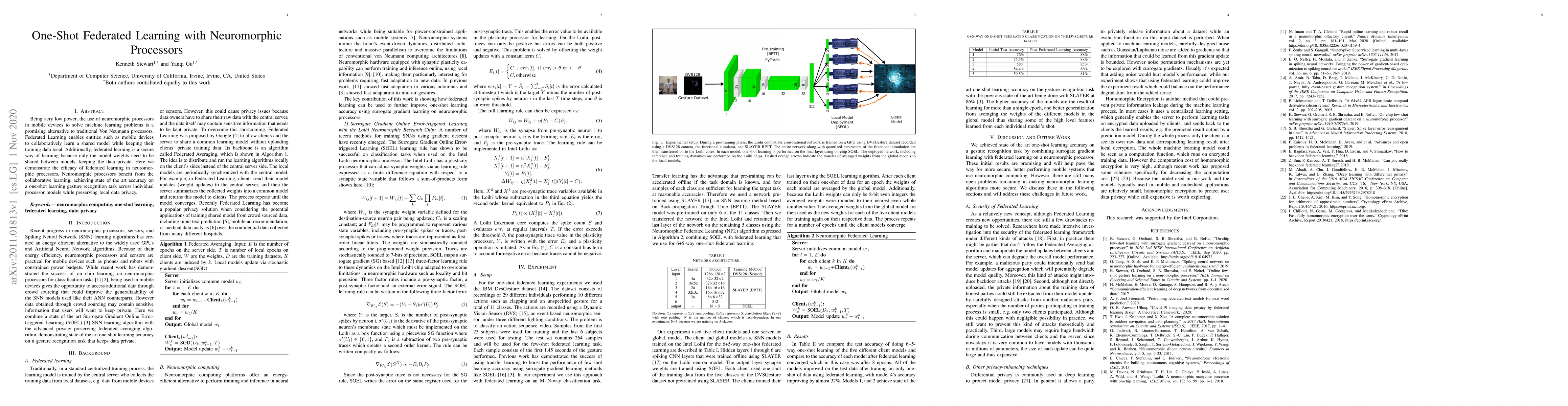 This paper explores the use of neuromorphic processors in federated learning to achieve low power, one-shot learning for gesture recognition tasks, demonstrating state-of-the-art accuracy while maintaining local data privacy. The study highlights the benefits of neuromorphic processors in federated learning scenarios.
