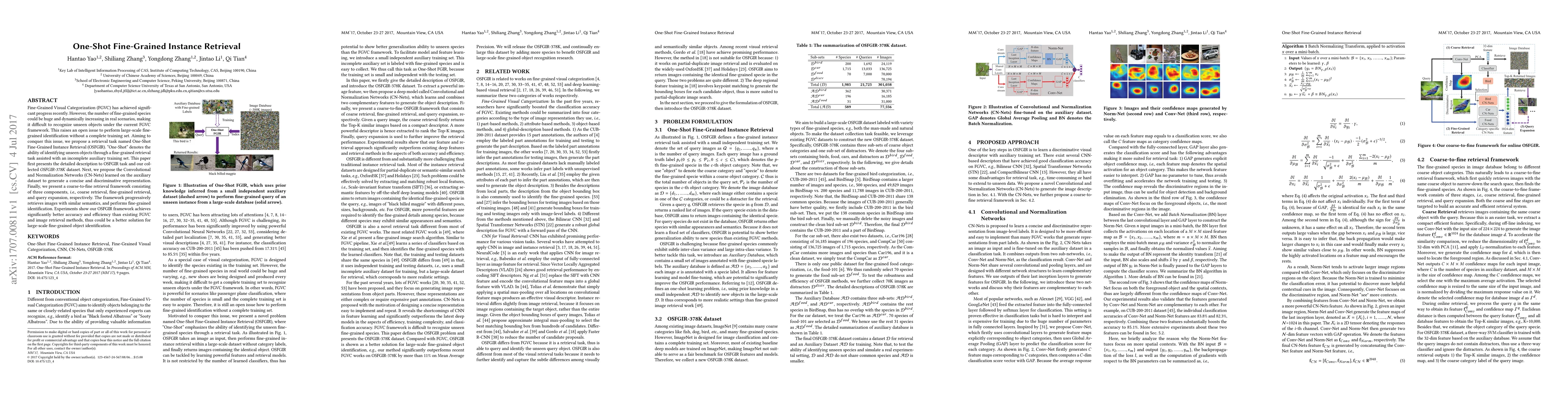 This paper introduces the One-Shot Fine-Grained Instance Retrieval (OSFGIR) task to address the challenge of identifying unseen objects in large-scale fine-grained visual categorization without a complete training set. It proposes a CN-Nets model and a coarse-to-fine retrieval framework for efficient and accurate fine-grained identification, demonstrating superior performance over existing methods.