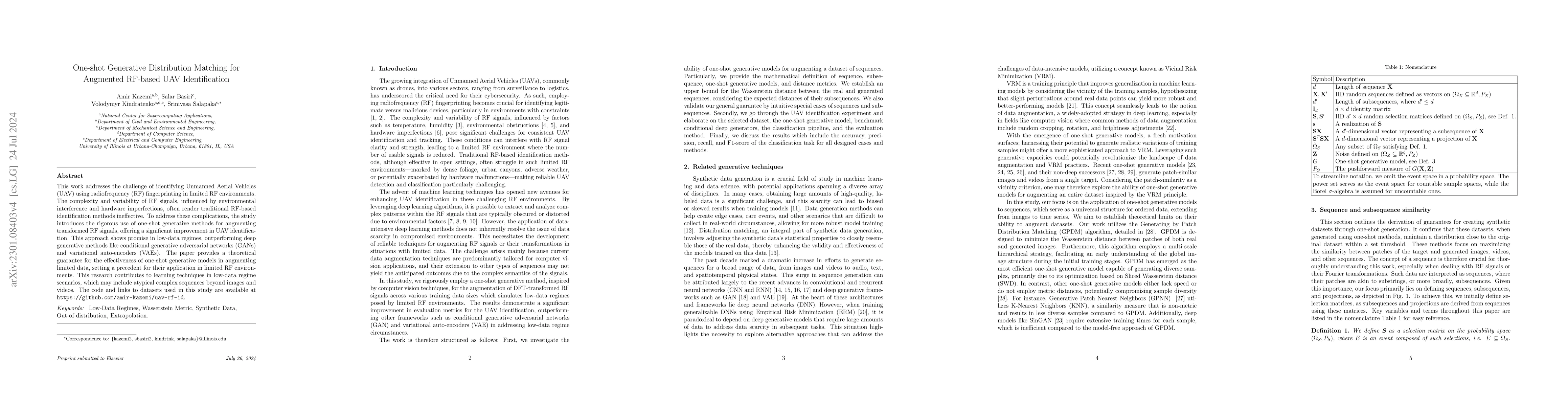 This work addresses the pressing need for cybersecurity in Unmanned Aerial Vehicles (UAVs), particularly focusing on the challenges of identifying UAVs using radiofrequency (RF) fingerprinting in constrained environments. The complexity and variability of RF signals, influenced by environmental interference and hardware imperfections, often render traditional RF-based identification methods ineffective. To address these complications, the study introduces the rigorous use of one-shot generative methods for augmenting transformed RF signals, offering a significant improvement in UAV identification. This approach shows promise in low-data regimes, outperforming deep generative methods like conditional generative adversarial networks (GANs) and variational autoencoders (VAEs). The paper provides a theoretical guarantee for the effectiveness of one-shot generative models in augmenting limited data, setting a precedent for their application in limited RF environments. This research not only contributes to the cybersecurity of UAVs but also rigorously broadens the scope of machine learning techniques in data-constrained scenarios, which may include atypical complex sequences beyond images and videos.