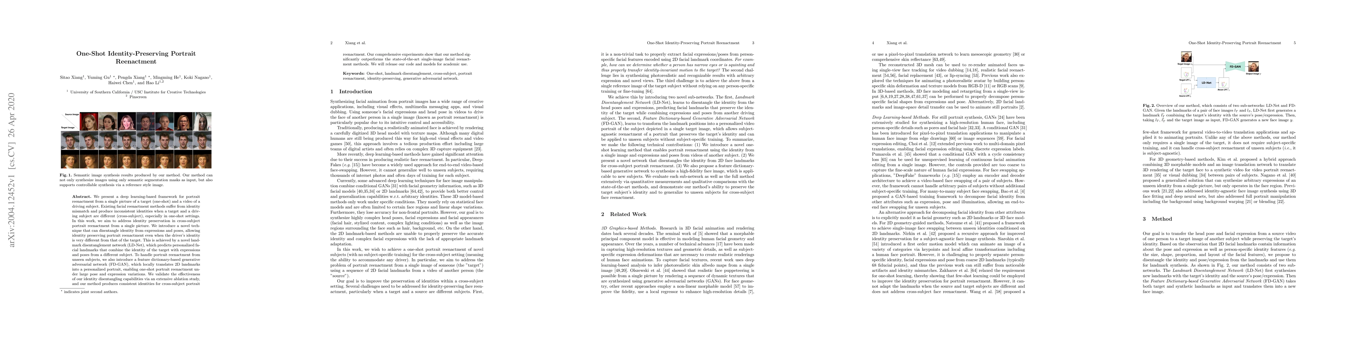 This paper introduces a deep learning framework for one-shot portrait reenactment that preserves the identity of a target from a single picture, even when driven by a different subject. It employs a novel landmark disentanglement network and a feature dictionary-based GAN to achieve identity-preserving reenactment under large pose and expression variations, outperforming existing methods.