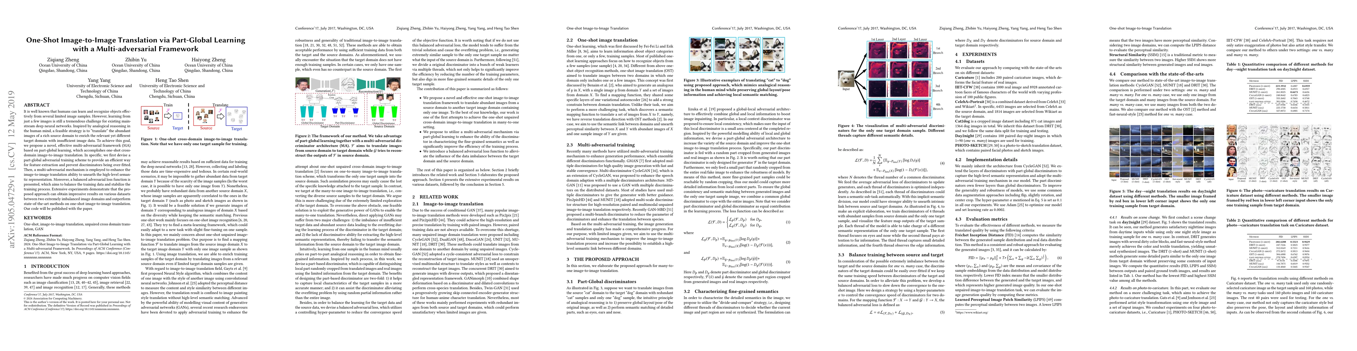 It is well known that humans can learn and recognize objects effectively from several limited image samples. However, learning from just a few images is still a tremendous challenge for existing main-stream deep neural networks. Inspired by analogical reasoning in the human mind, a feasible strategy is to translate the abundant images of a rich source domain to enrich the relevant yet different target domain with insufficient image data. To achieve this goal, we propose a novel, effective multi-adversarial framework (MA) based on part-global learning, which accomplishes one-shot cross-domain image-to-image translation. In specific, we first devise a part-global adversarial training scheme to provide an efficient way for feature extraction and prevent discriminators being over-fitted. Then, a multi-adversarial mechanism is employed to enhance the image-to-image translation ability to unearth the high-level semantic representation. Moreover, a balanced adversarial loss function is presented, which aims to balance the training data and stabilize the training process. Extensive experiments demonstrate that the proposed approach can obtain impressive results on various datasets between two extremely imbalanced image domains and outperform state-of-the-art methods on one-shot image-to-image translation.