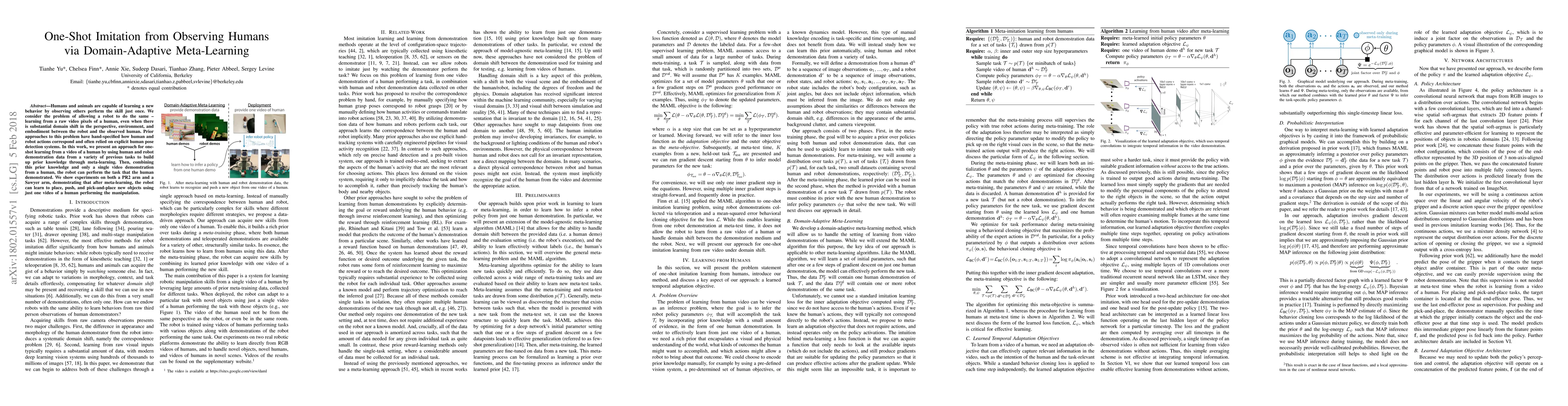This paper proposes a meta-learning approach for robots to perform one-shot imitation learning from human demonstrations, even with significant domain shifts. By leveraging prior knowledge from various human and robot demonstrations, the robot can adapt to new tasks using only a single video of human action.