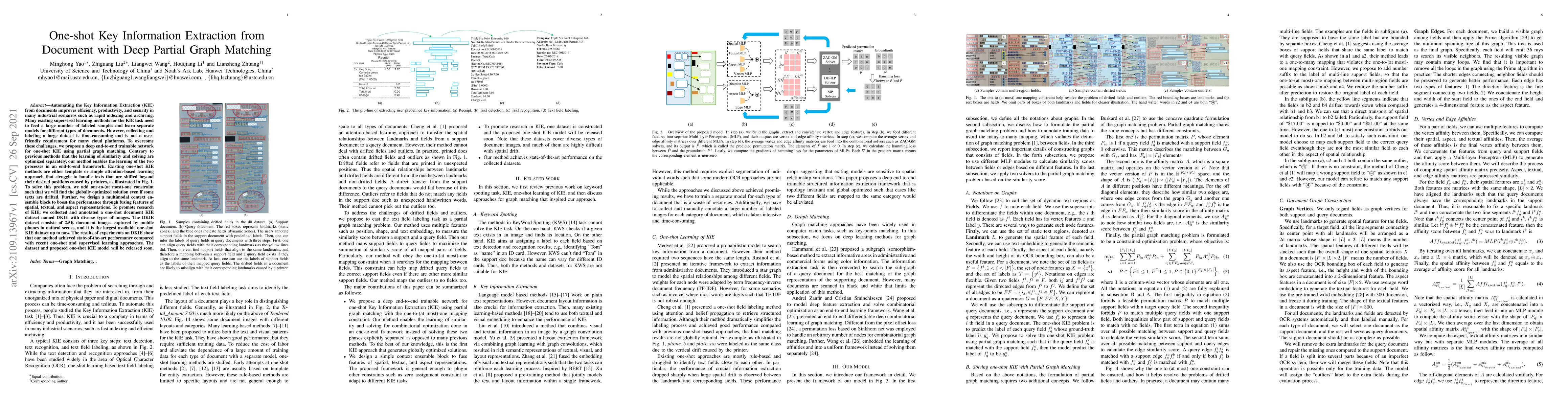 Automating the Key Information Extraction (KIE) from documents improves efficiency, productivity, and security in many industrial scenarios such as rapid indexing and archiving. Many existing supervised learning methods for the KIE task need to feed a large number of labeled samples and learn separate models for different types of documents. However, collecting and labeling a large dataset is time-consuming and is not a user-friendly requirement for many cloud platforms. To overcome these challenges, we propose a deep end-to-end trainable network for one-shot KIE using partial graph matching. Contrary to previous methods that the learning of similarity and solving are optimized separately, our method enables the learning of the two processes in an end-to-end framework. Existing one-shot KIE methods are either template or simple attention-based learning approach that struggle to handle texts that are shifted beyond their desired positions caused by printers, as illustrated in Fig.1. To solve this problem, we add one-to-(at most)-one constraint such that we will find the globally optimized solution even if some texts are drifted. Further, we design a multimodal context ensemble block to boost the performance through fusing features of spatial, textual, and aspect representations. To promote research of KIE, we collected and annotated a one-shot document KIE dataset named DKIE with diverse types of images. The DKIE dataset consists of 2.5K document images captured by mobile phones in natural scenes, and it is the largest available one-shot KIE dataset up to now. The results of experiments on DKIE show that our method achieved state-of-the-art performance compared with recent one-shot and supervised learning approaches. The dataset and proposed one-shot KIE model will be released soo