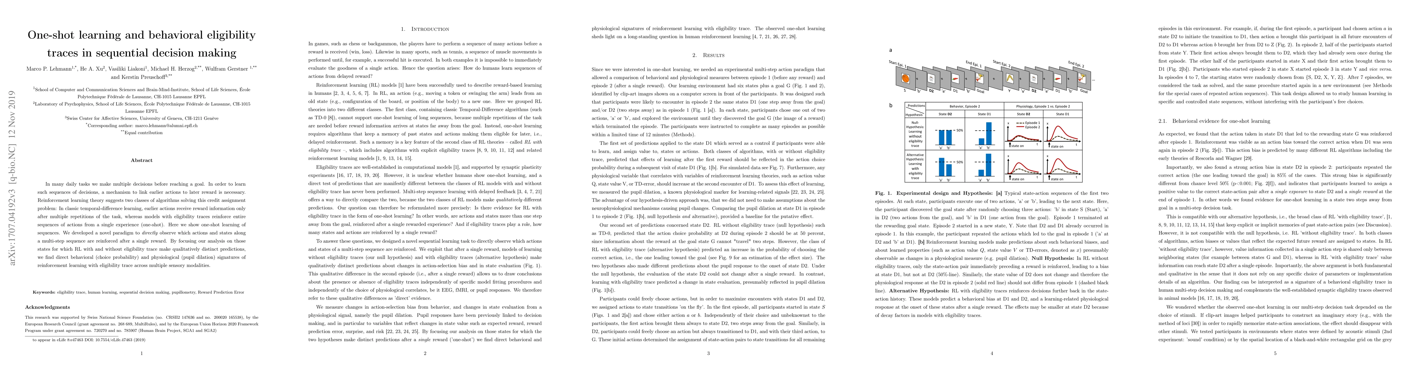 In many daily tasks we make multiple decisions before reaching a goal. In order to learn such sequences of decisions, a mechanism to link earlier actions to later reward is necessary. Reinforcement learning theory suggests two classes of algorithms solving this credit assignment problem: In classic temporal-difference learning, earlier actions receive reward information only after multiple repetitions of the task, whereas models with eligibility traces reinforce entire sequences of actions from a single experience (one-shot). Here we asked whether humans use eligibility traces. We developed a novel paradigm to directly observe which actions and states along a multi-step sequence are reinforced after a single reward. By focusing our analysis on those states for which RL with and without eligibility trace make qualitatively distinct predictions, we find direct behavioral (choice probability) and physiological (pupil dilation) signatures of reinforcement learning with eligibility trace across multiple sensory modalities.