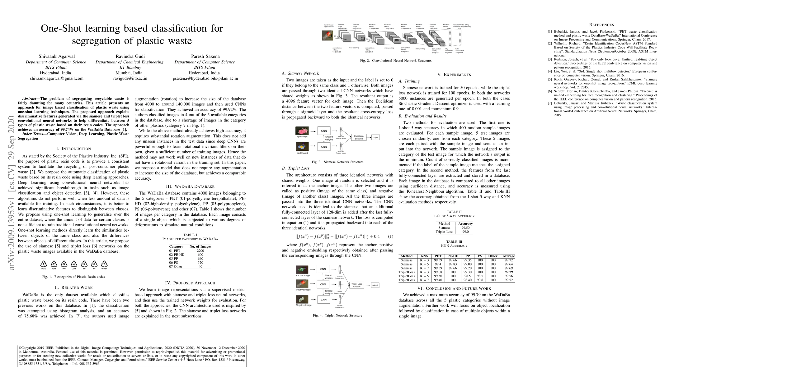 The problem of segregating recyclable waste is fairly daunting for many countries. This article presents an approach for image based classification of plastic waste using one-shot learning techniques. The proposed approach exploits discriminative features generated via the siamese and triplet loss convolutional neural networks to help differentiate between 5 types of plastic waste based on their resin codes. The approach achieves an accuracy of 99.74% on the WaDaBa Database