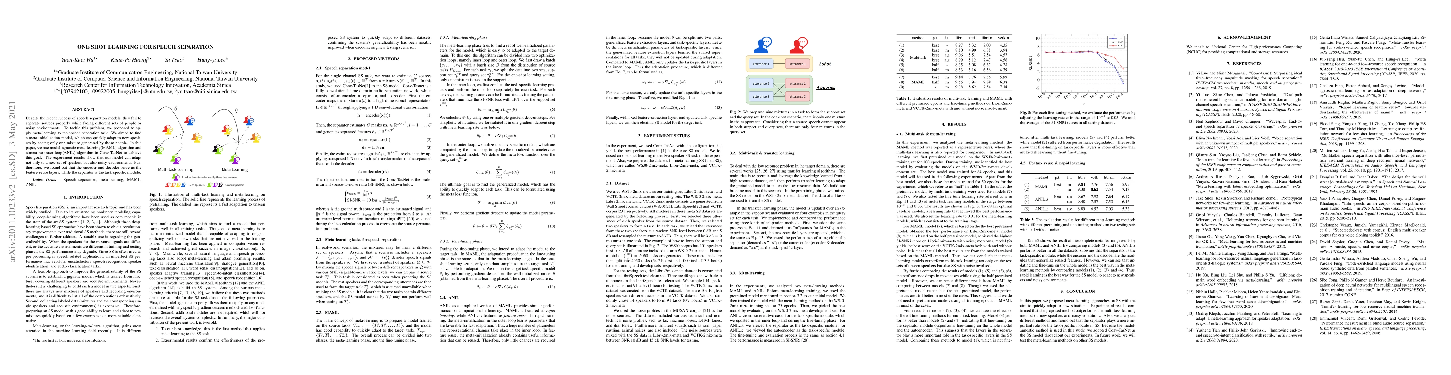 This paper proposes a meta-learning approach using MAML and ANIL algorithms in Conv-TasNet for one-shot learning in speech separation, enabling rapid adaptation to new speakers and noisy environments with minimal training data. The encoder and decoder facilitate feature reuse, while the separator is the task-specific module.