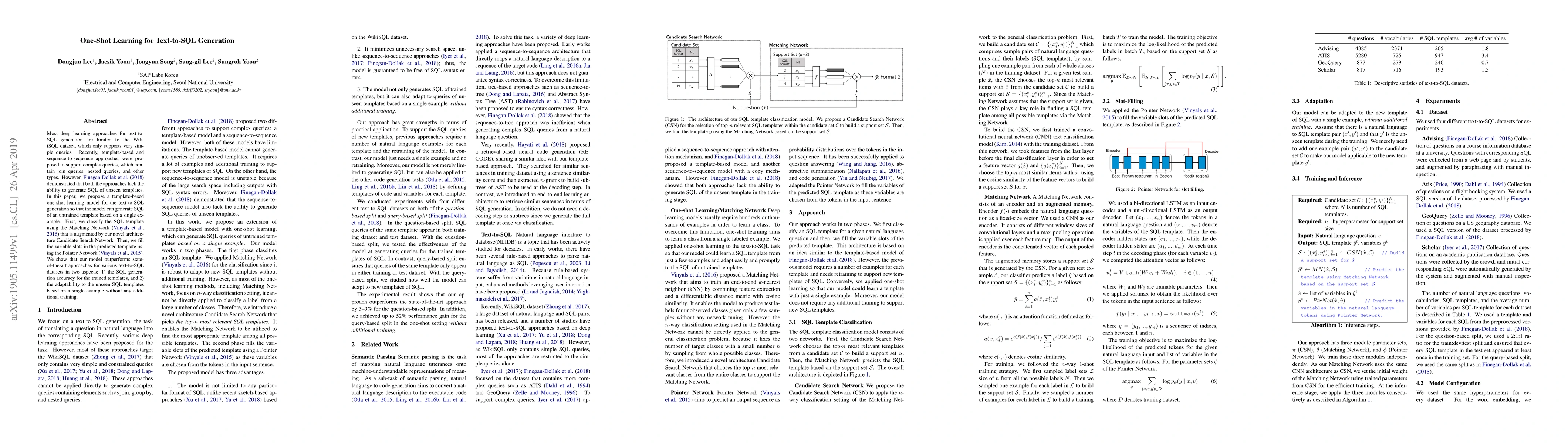 This paper introduces a template-based one-shot learning model for text-to-SQL generation that can produce SQL queries for untrained templates using a single example. The proposed method employs a Matching Network and a Candidate Search Network for template classification, and a Pointer Network for filling variable slots, outperforming existing approaches in both trained and unseen template adaptability.