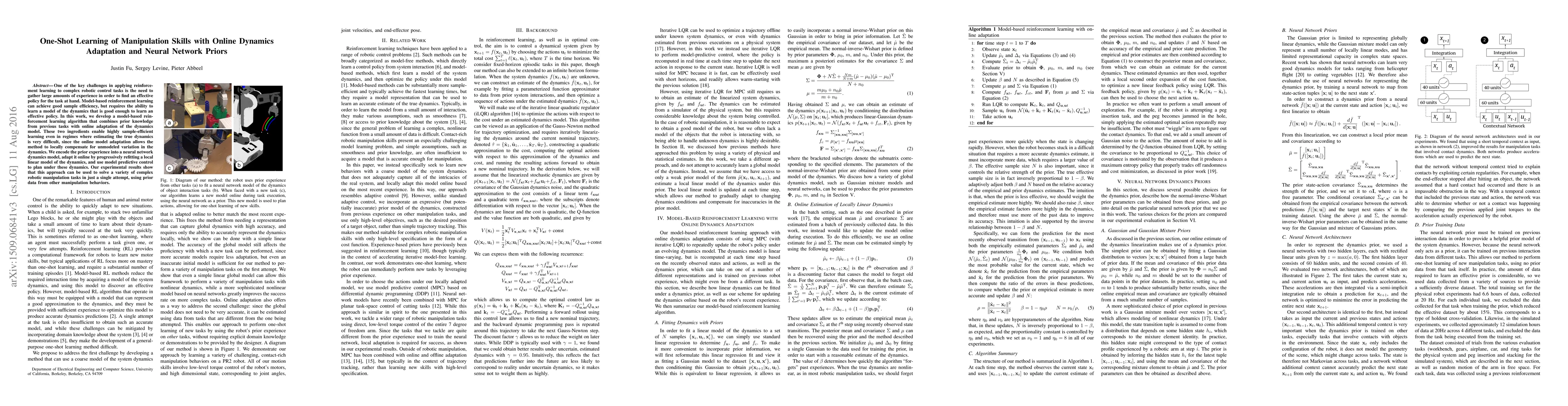 One of the key challenges in applying reinforcement learning to complex robotic control tasks is the need to gather large amounts of experience in order to find an effective policy for the task at hand. Model-based reinforcement learning can achieve good sample efficiency, but requires the ability to learn a model of the dynamics that is good enough to learn an effective policy. In this work, we develop a model-based reinforcement learning algorithm that combines prior knowledge from previous tasks with online adaptation of the dynamics model. These two ingredients enable highly sample-efficient learning even in regimes where estimating the true dynamics is very difficult, since the online model adaptation allows the method to locally compensate for unmodeled variation in the dynamics. We encode the prior experience into a neural network dynamics model, adapt it online by progressively refitting a local linear model of the dynamics, and use model predictive control to plan under these dynamics. Our experimental results show that this approach can be used to solve a variety of complex robotic manipulation tasks in just a single attempt, using prior data from other manipulation behaviors.