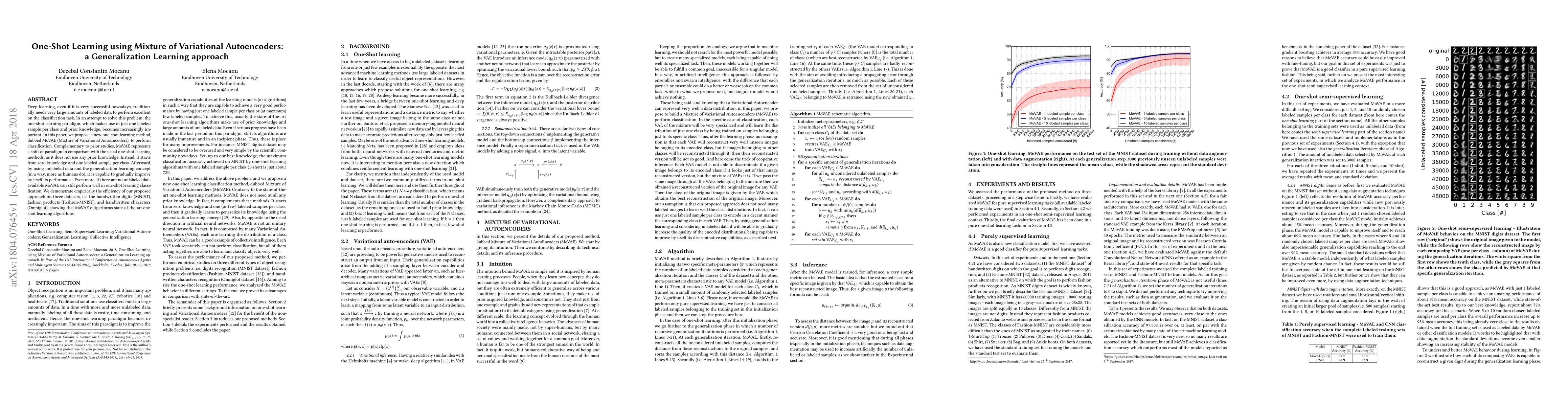 Deep learning, even if it is very successful nowadays, traditionally needs very large amounts of labeled data to perform excellent on the classification task. In an attempt to solve this problem, the one-shot learning paradigm, which makes use of just one labeled sample per class and prior knowledge, becomes increasingly important. In this paper, we propose a new one-shot learning method, dubbed MoVAE (Mixture of Variational AutoEncoders), to perform classification. Complementary to prior studies, MoVAE represents a shift of paradigm in comparison with the usual one-shot learning methods, as it does not use any prior knowledge. Instead, it starts from zero knowledge and one labeled sample per class. Afterward, by using unlabeled data and the generalization learning concept (in a way, more as humans do), it is capable to gradually improve by itself its performance. Even more, if there are no unlabeled data available MoVAE can still perform well in one-shot learning classification. We demonstrate empirically the efficiency of our proposed approach on three datasets, i.e. the handwritten digits (MNIST), fashion products (Fashion-MNIST), and handwritten characters (Omniglot), showing that MoVAE outperforms state-of-the-art one-shot learning algorithms.