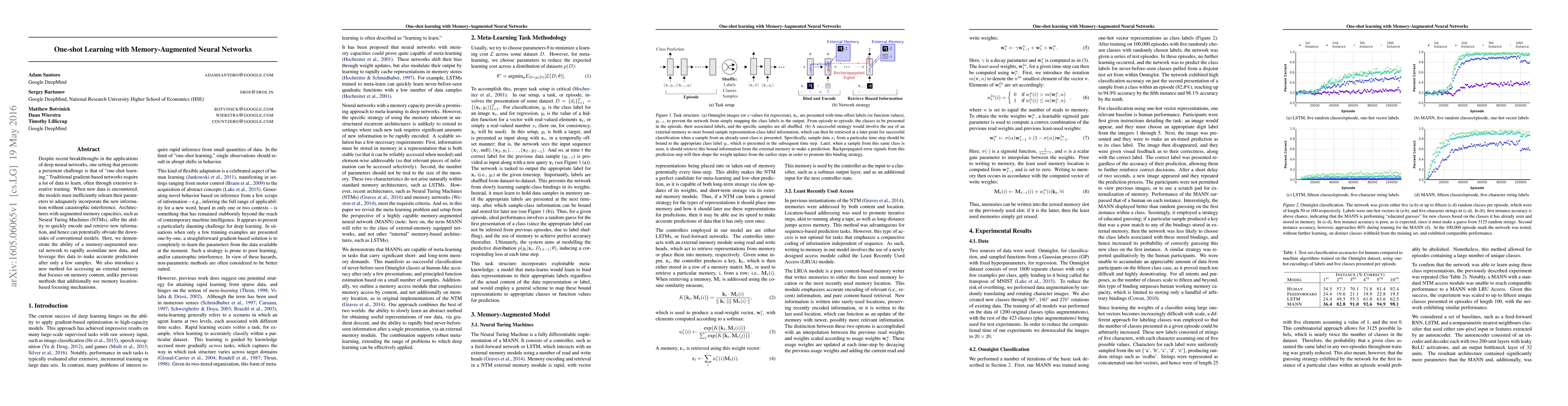 Despite recent breakthroughs in the applications of deep neural networks, one setting that presents a persistent challenge is that of "one-shot learning." Traditional gradient-based networks require a lot of data to learn, often through extensive iterative training. When new data is encountered, the models must inefficiently relearn their parameters to adequately incorporate the new information without catastrophic interference. Architectures with augmented memory capacities, such as Neural Turing Machines (NTMs), offer the ability to quickly encode and retrieve new information, and hence can potentially obviate the downsides of conventional models. Here, we demonstrate the ability of a memory-augmented neural network to rapidly assimilate new data, and leverage this data to make accurate predictions after only a few samples. We also introduce a new method for accessing an external memory that focuses on memory content, unlike previous methods that additionally use memory location-based focusing mechanisms.