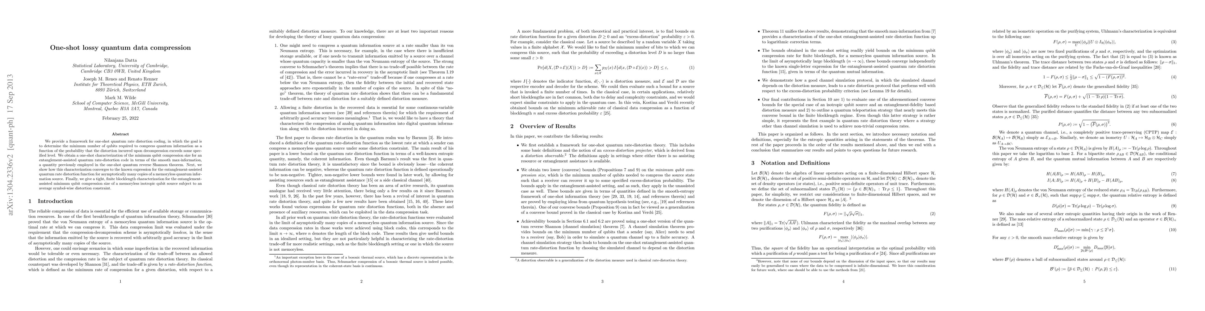 This paper develops a framework for one-shot quantum rate distortion coding, determining the minimum qubit count for compressing quantum data while controlling distortion probability. It connects this to the smooth max-information and shows convergence to known results for large quantum data sets.