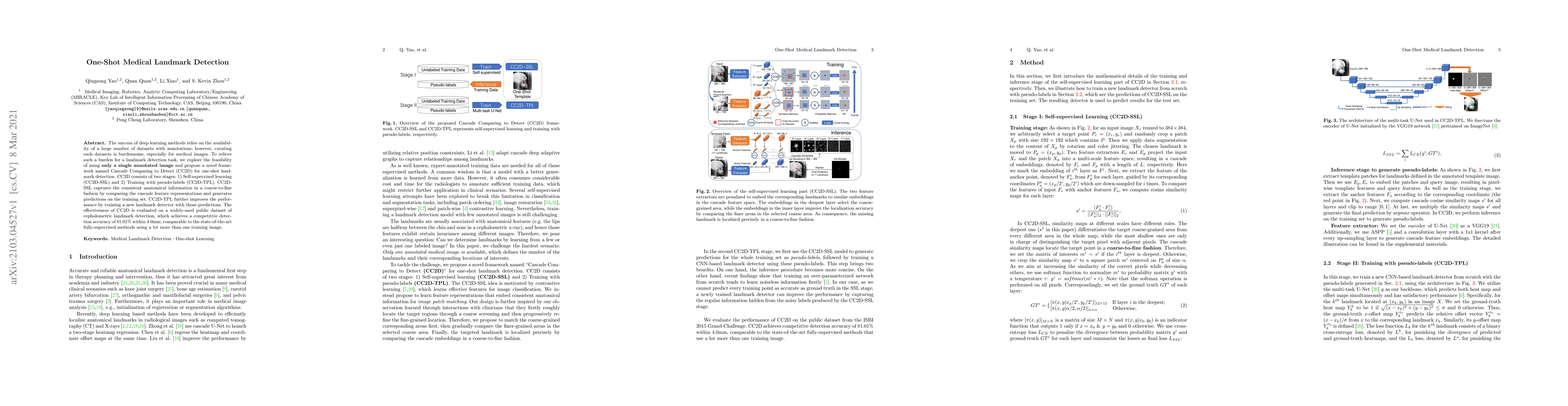 This paper proposes a novel framework, Cascade Comparing to Detect (CC2D), for one-shot medical landmark detection using only a single annotated image. The framework employs self-supervised learning and pseudo-label training to achieve competitive detection accuracy comparable to fully-supervised methods.