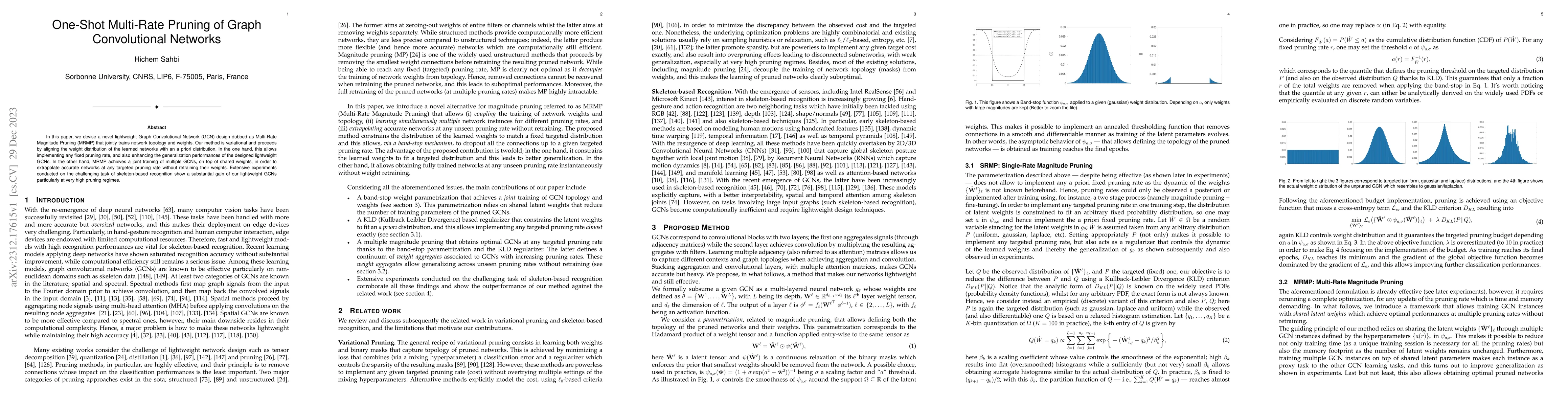 In this paper, we devise a novel lightweight Graph Convolutional Network (GCN) design dubbed as Multi-Rate Magnitude Pruning (MRMP) that jointly trains network topology and weights. Our method is variational and proceeds by aligning the weight distribution of the learned networks with an a priori distribution. In the one hand, this allows implementing any fixed pruning rate, and also enhancing the generalization performances of the designed lightweight GCNs. In the other hand, MRMP achieves a joint training of multiple GCNs, on top of shared weights, in order to extrapolate accurate networks at any targeted pruning rate without retraining their weights. Extensive experiments conducted on the challenging task of skeleton-based recognition show a substantial gain of our lightweight GCNs particularly at very high pruning regimes.