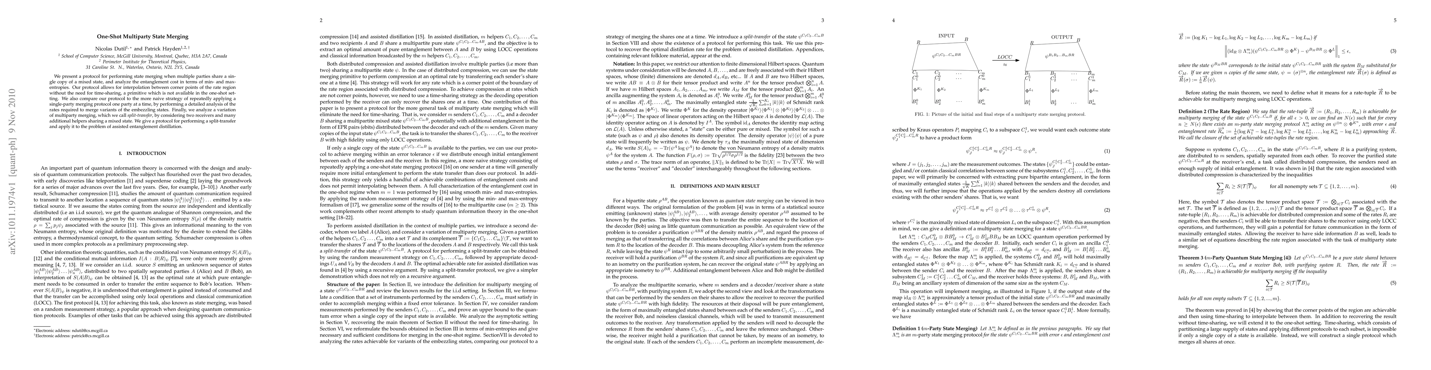 This paper introduces a novel protocol for one-shot multiparty state merging, analyzing the entanglement cost without time-sharing. It compares the proposed method to a naive sequential merging approach and explores a variant called split-transfer for assisted entanglement distillation.