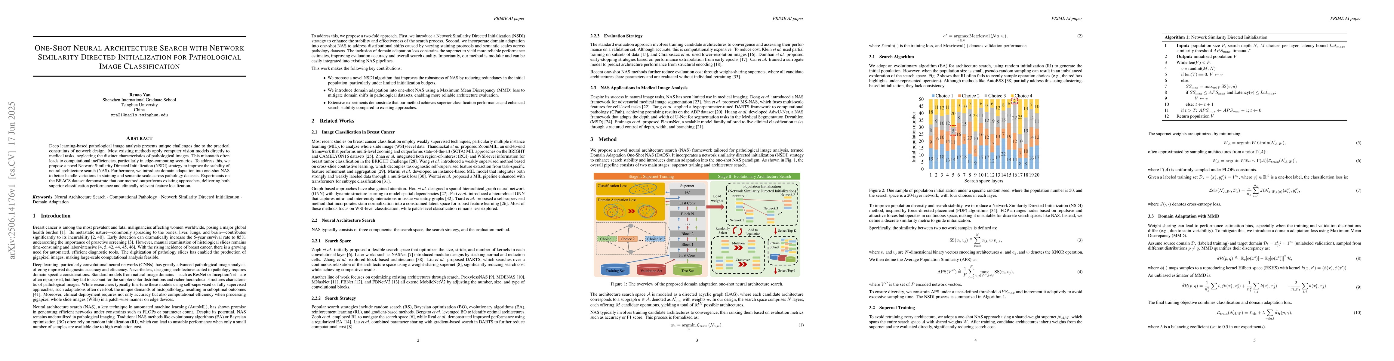 Deep learning-based pathological image analysis presents unique challenges due to the practical constraints of network design. Most existing methods apply computer vision models directly to medical tasks, neglecting the distinct characteristics of pathological images. This mismatch often leads to computational inefficiencies, particularly in edge-computing scenarios. To address this, we propose a novel Network Similarity Directed Initialization (NSDI) strategy to improve the stability of neural architecture search (NAS). Furthermore, we introduce domain adaptation into one-shot NAS to better handle variations in staining and semantic scale across pathology datasets. Experiments on the BRACS dataset demonstrate that our method outperforms existing approaches, delivering both superior classification performance and clinically relevant feature localization.