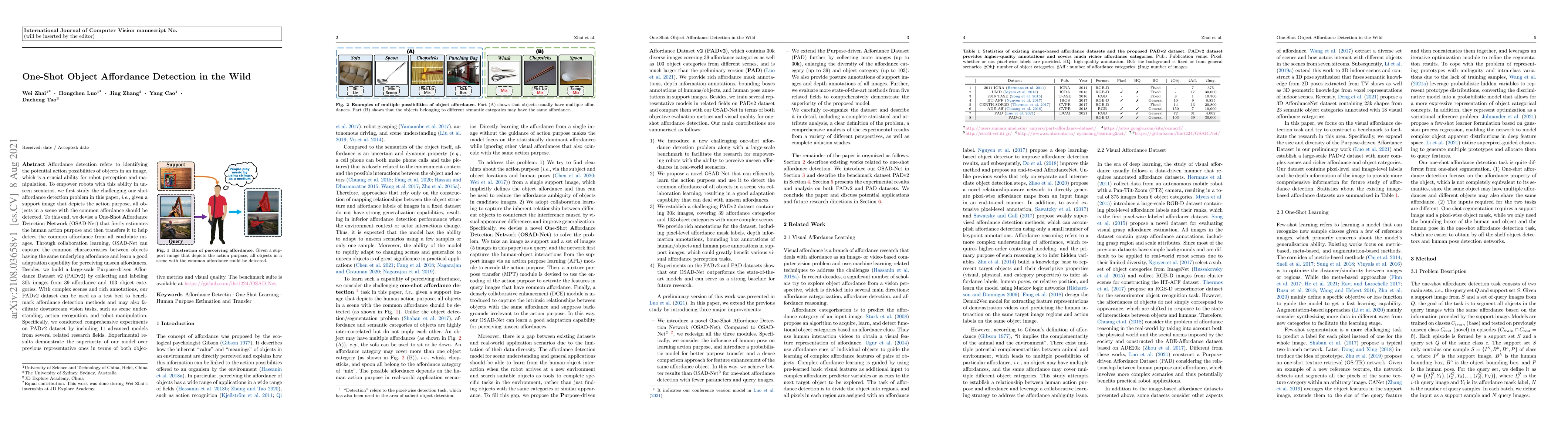 Affordance detection refers to identifying the potential action possibilities of objects in an image, which is a crucial ability for robot perception and manipulation. To empower robots with this ability in unseen scenarios, we first study the challenging one-shot affordance detection problem in this paper, i.e., given a support image that depicts the action purpose, all objects in a scene with the common affordance should be detected. To this end, we devise a One-Shot Affordance Detection Network (OSAD-Net) that firstly estimates the human action purpose and then transfers it to help detect the common affordance from all candidate images. Through collaboration learning, OSAD-Net can capture the common characteristics between objects having the same underlying affordance and learn a good adaptation capability for perceiving unseen affordances. Besides, we build a large-scale Purpose-driven Affordance Dataset v2 (PADv2) by collecting and labeling 30k images from 39 affordance and 103 object categories. With complex scenes and rich annotations, our PADv2 dataset can be used as a test bed to benchmark affordance detection methods and may also facilitate downstream vision tasks, such as scene understanding, action recognition, and robot manipulation. Specifically, we conducted comprehensive experiments on PADv2 dataset by including 11 advanced models from several related research fields. Experimental results demonstrate the superiority of our model over previous representative ones in terms of both objective metrics and visual quality. The benchmark suite is available at https://github.com/lhc1224/OSAD Net.