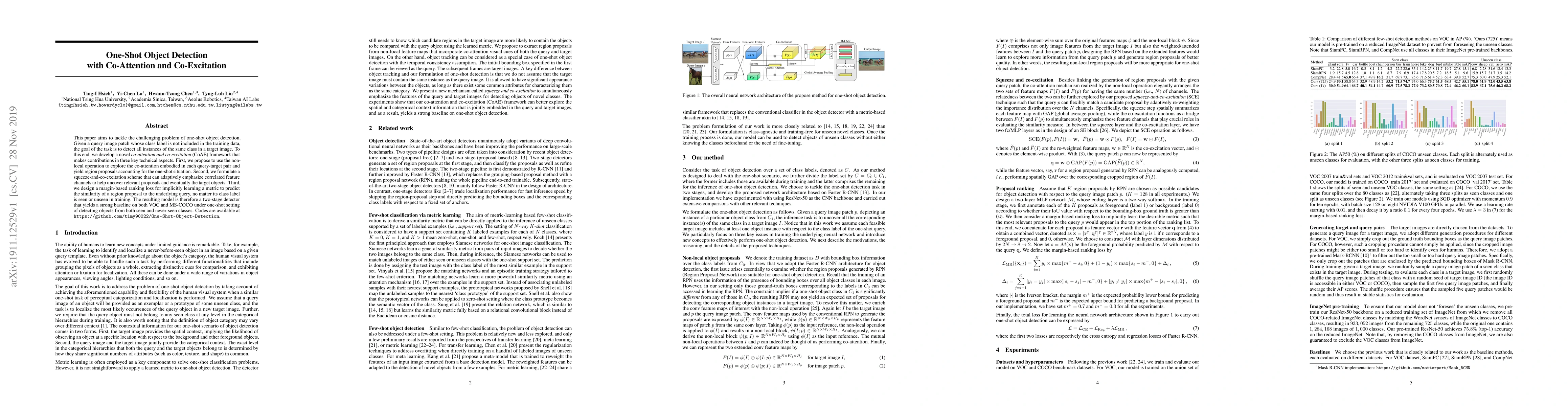 This paper proposes a novel one-shot object detection framework called CoAE, which uses co-attention and co-excitation to detect objects in target images without training data for the class label, achieving strong baseline results on VOC and MS-COCO datasets.